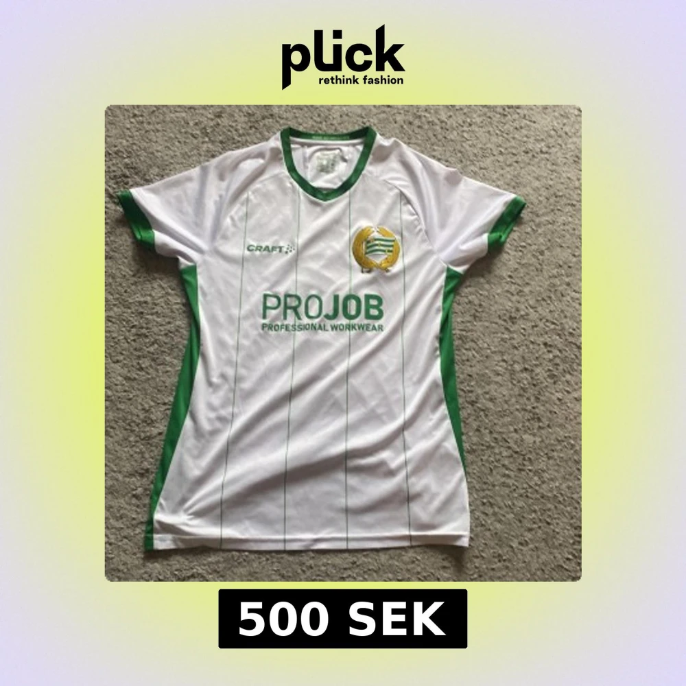 Säljer en officiell Hammarby IF fotbollströja från Craft. Tröjan är vit med tunna gröna ränder, gröna detaljer vid ärmslut och krage samt klubbmärke på bröstet. Materialet är lätt och andas, perfekt för match eller träning. Sponsorlogga PROJOB på framsidan. Storleken är medium men passar även small.