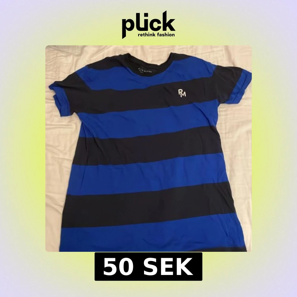 Snygg t-shirt från Race Marine i storlek M med breda blå och svarta ränder. Klassisk passform med korta ärmar och rund hals. Liten broderad RM-logga på bröstet. Perfekt för en sportig och avslappnad stil.