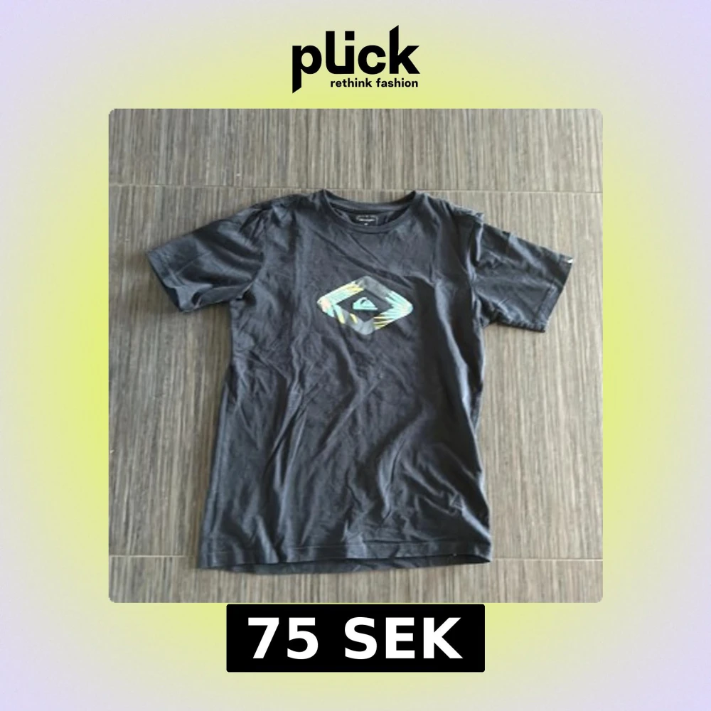 Säljer en svart t-shirt från Quiksilver med ett tryck på bröstet. T-shirten är kortärmad och gjord i bomull, perfekt för en avslappnad stil. Passar bra till både jeans och shorts. Hör av dig vid intresse! Pris kan diskuteras.