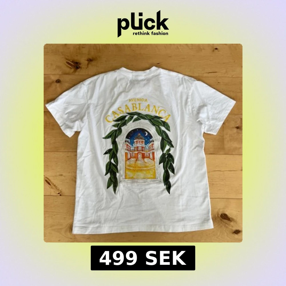 Vit t-shirt från Casablanca med färgglad tryckt grafik på både bröstet och ryggen. Motivet visar en byggnad i nattmiljö omgiven av gröna blad och texten 'Avenida Casablanca' i gult. Klassisk rund hals och korta ärmar. Skön bomullskvalitet. Storleken är M men passar S.