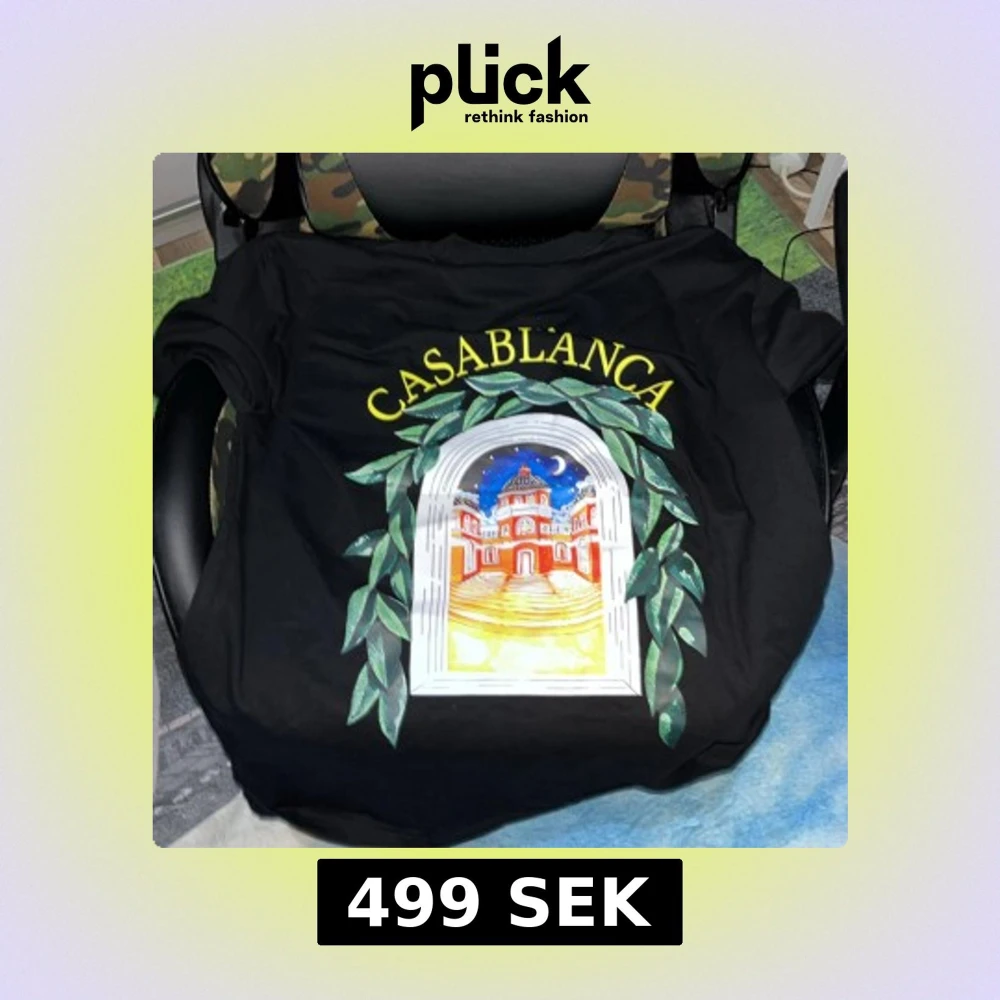 Svart t-shirt från Casablanca med färgglatt tryck av en byggnad och gröna blad, samt gul text på bröstet och ryggen. Klassisk passform och rund hals. Perfekt statement-plagg för dig som gillar unika prints och streetstyle.