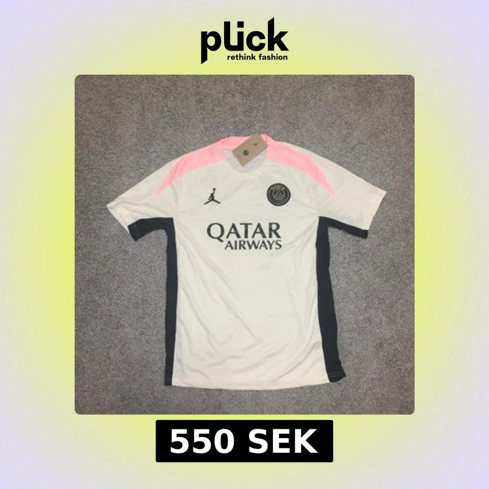 Säljer en PSG x Jordan fotbollströja i vitt med svarta och rosa detaljer. Tröjan har korta ärmar, svart logga och Paris Saint-Germain-märke på bröstet. Materialet är lätt och andas, perfekt för träning eller match. Matchande svarta shorts med rosa detaljer och PSG-logga ingår.