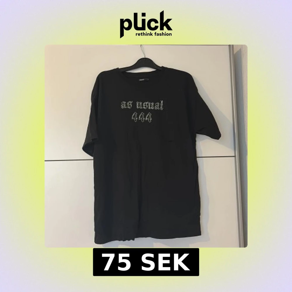 Svart oversized t-shirt från Cropp med coola strassdetaljer. Framsidan har texten 'as usual 444' i glittriga stenar och baksidan pryds av stora änglavingar i strass. Skön bomullskvalitet och loose fit för en avslappnad vibe.