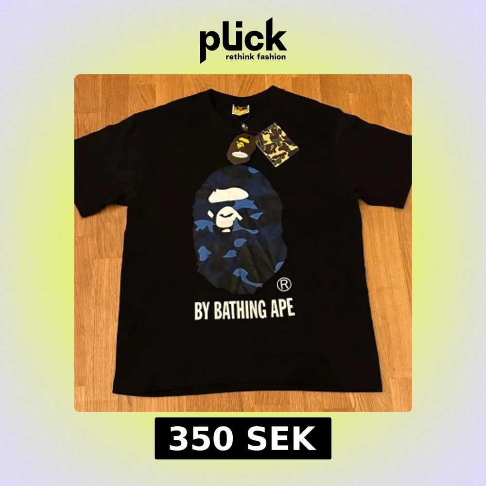 Svart t-shirt från BAPE med ikoniskt ape-huvud i blått camouflage tryck på bröstet och texten 'BY BATHING APE' under. Rund hals och korta ärmar. perfekt för streetwear och att sticka ut med cool grafik.