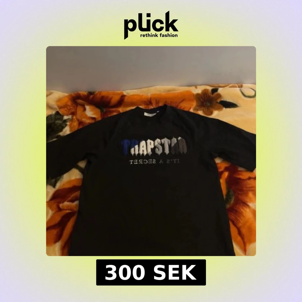 Säljer en svart t-shirt från Trapstar med tryck i vitt, blått och grått på bröstet där det står 'Trapstar It's a Secret'. Klassisk passform och rund halsringning. Perfekt för dig som gillar streetwear. Storlek M men passar även L