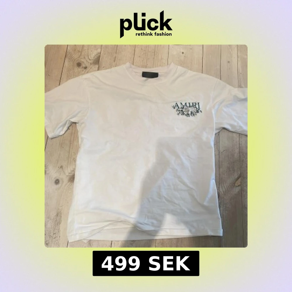 Säljer en vit t-shirt från Amiri med ett snyggt blommigt tryck i blått på både framsidan och baksidan. Perfekt för en stilren och avslappnad look. T-shirten har korta ärmar och en normal passform.