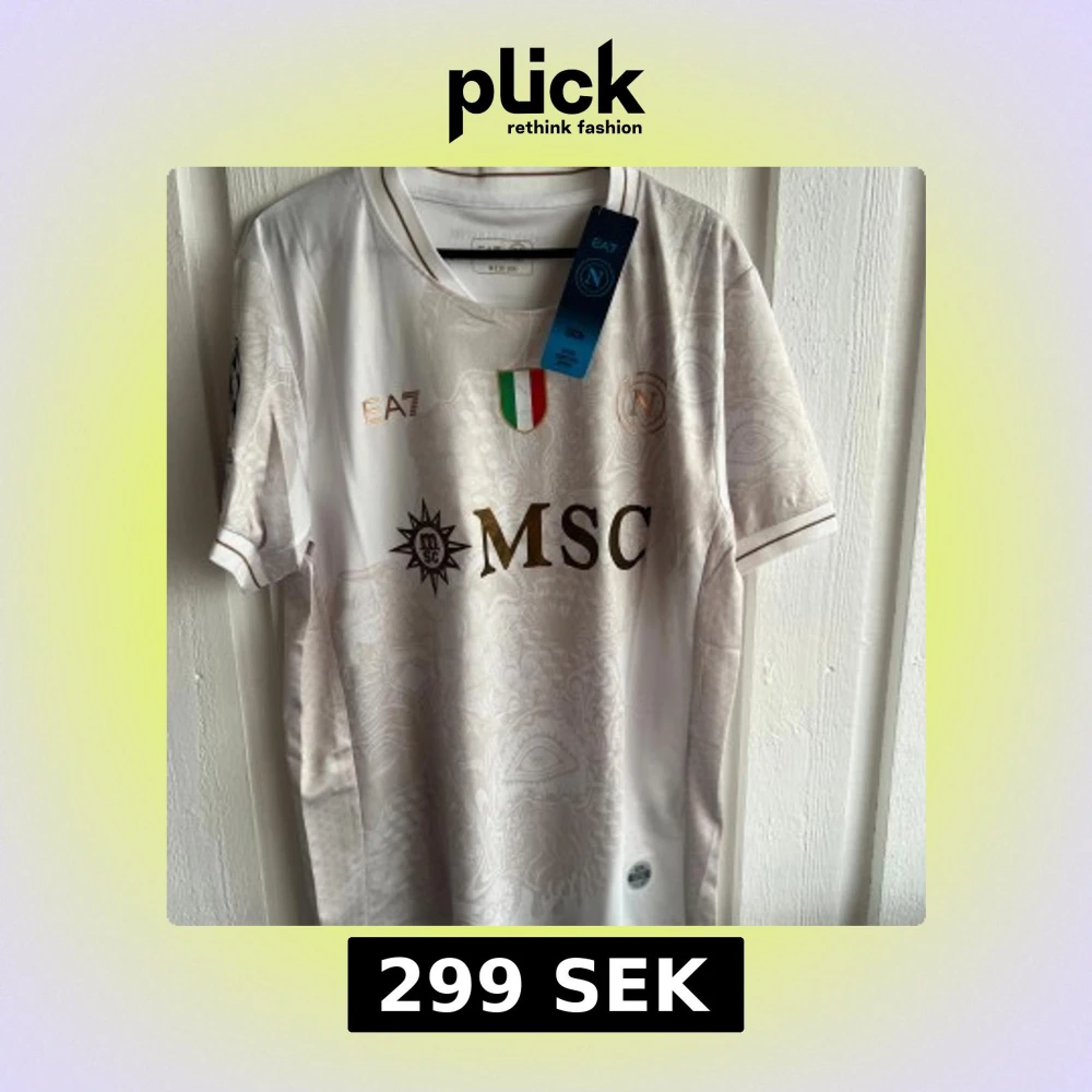 Napoli fotbollströja i vitt från EA7 med De Bruyne och nummer 11 på ryggen. Tröjan har korta ärmar, guldiga och svarta detaljer, diskret mönster och klubbmärke på bröstet. Tillverkad i lätt och ventilerande material, perfekt för match eller träning.