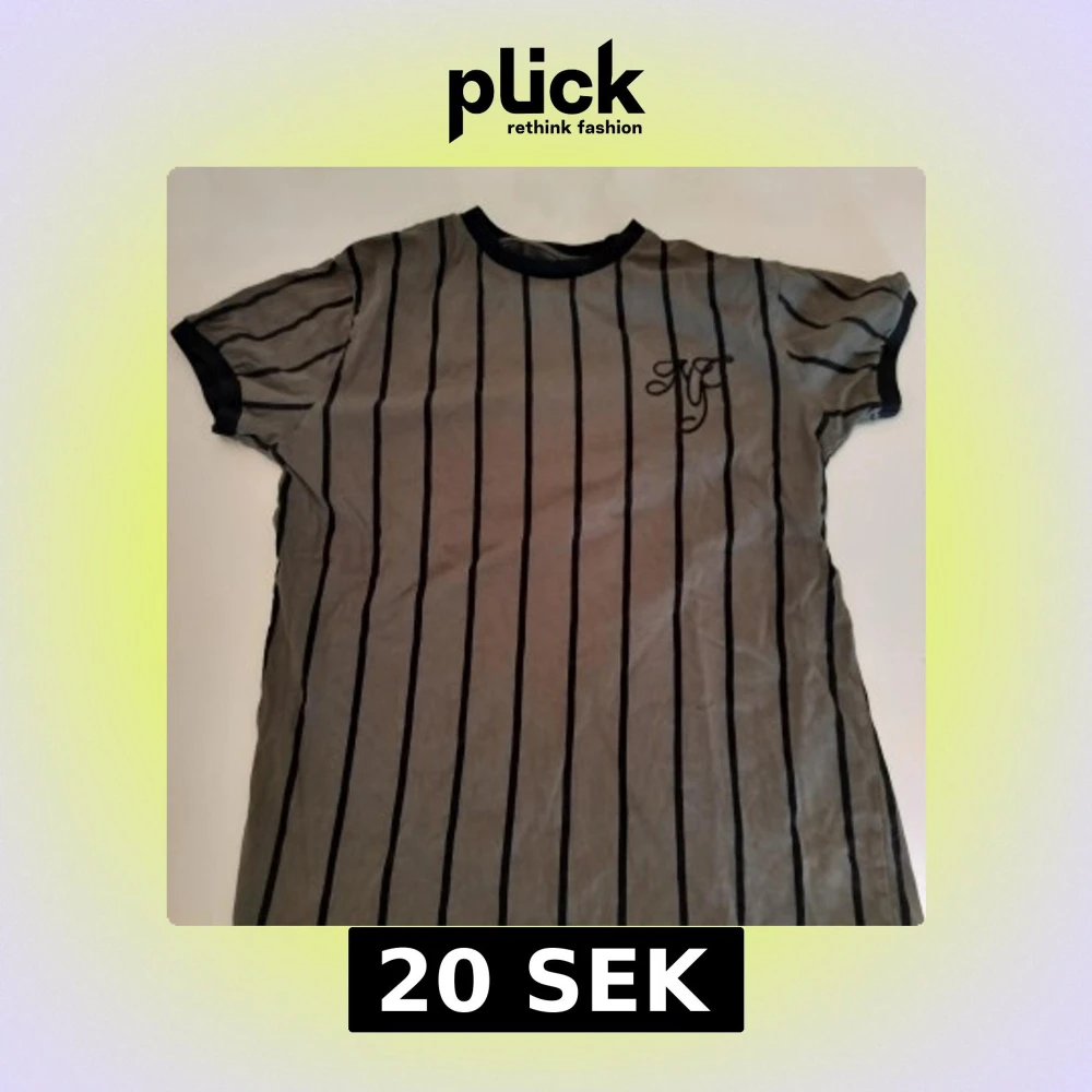 Grå t-shirt med svarta vertikala ränder och svart broderad logga på bröstet. Klassisk rund halsringning och svarta muddar vid ärmslut och hals. Skön passform och stilren design, perfekt för en chill look.