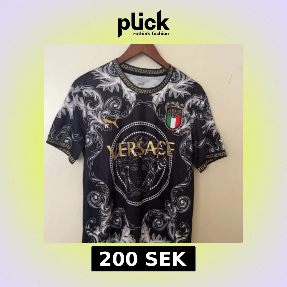 Snygg svart fotbollströja med guldiga detaljer och. Tröjan har korta ärmar, grekisk mönsterkant och ett stort Medusa-tryck framtill. Materialet är lätt och andas, perfekt för match eller streetwear.