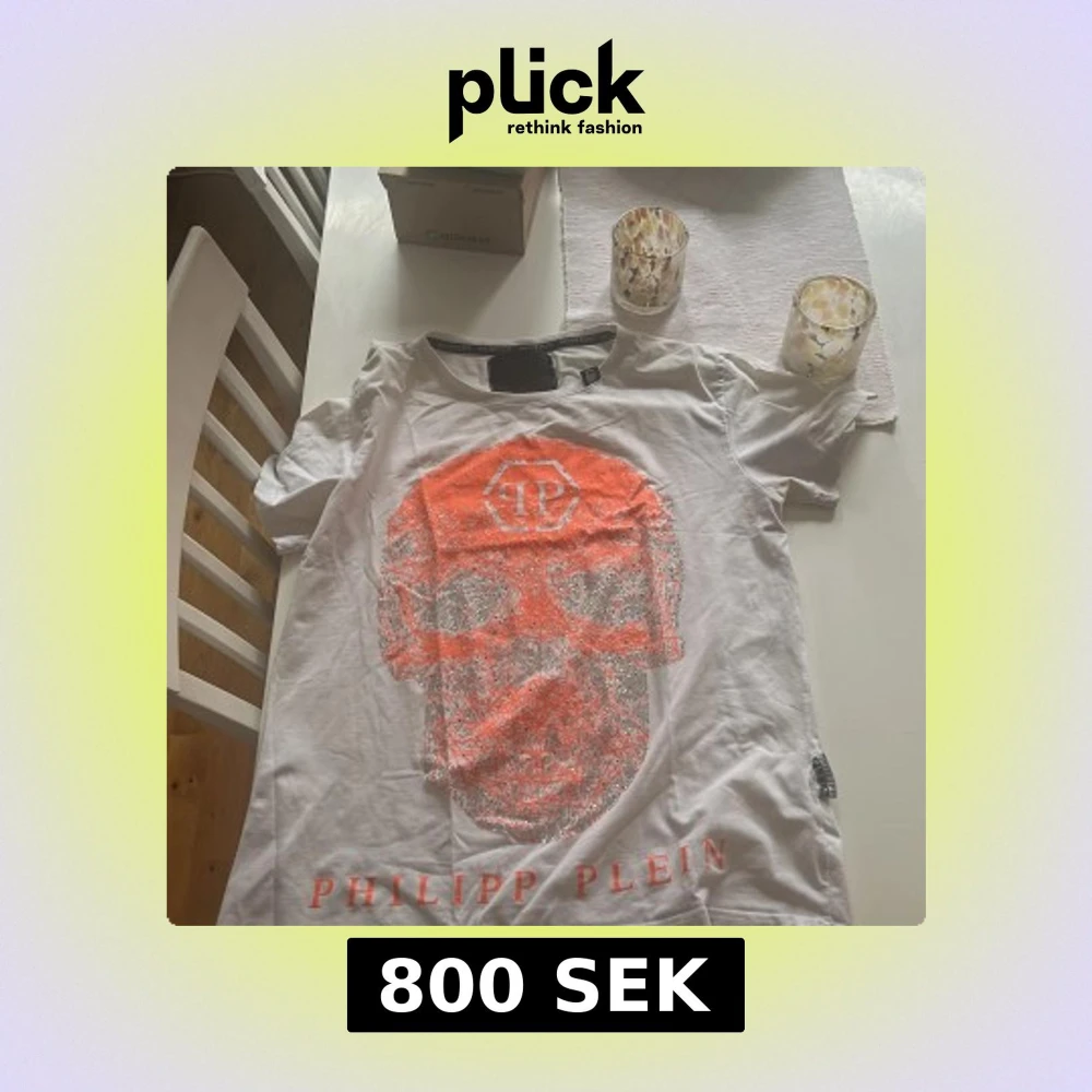 Säljer en vit t-shirt från Philipp Plein med en stor glittrig dödskalle i orange och silver på framsidan. T-shirten har rund halsringning och korta ärmar. Märkeslogga syns både i nacken och på insidan av kragen.