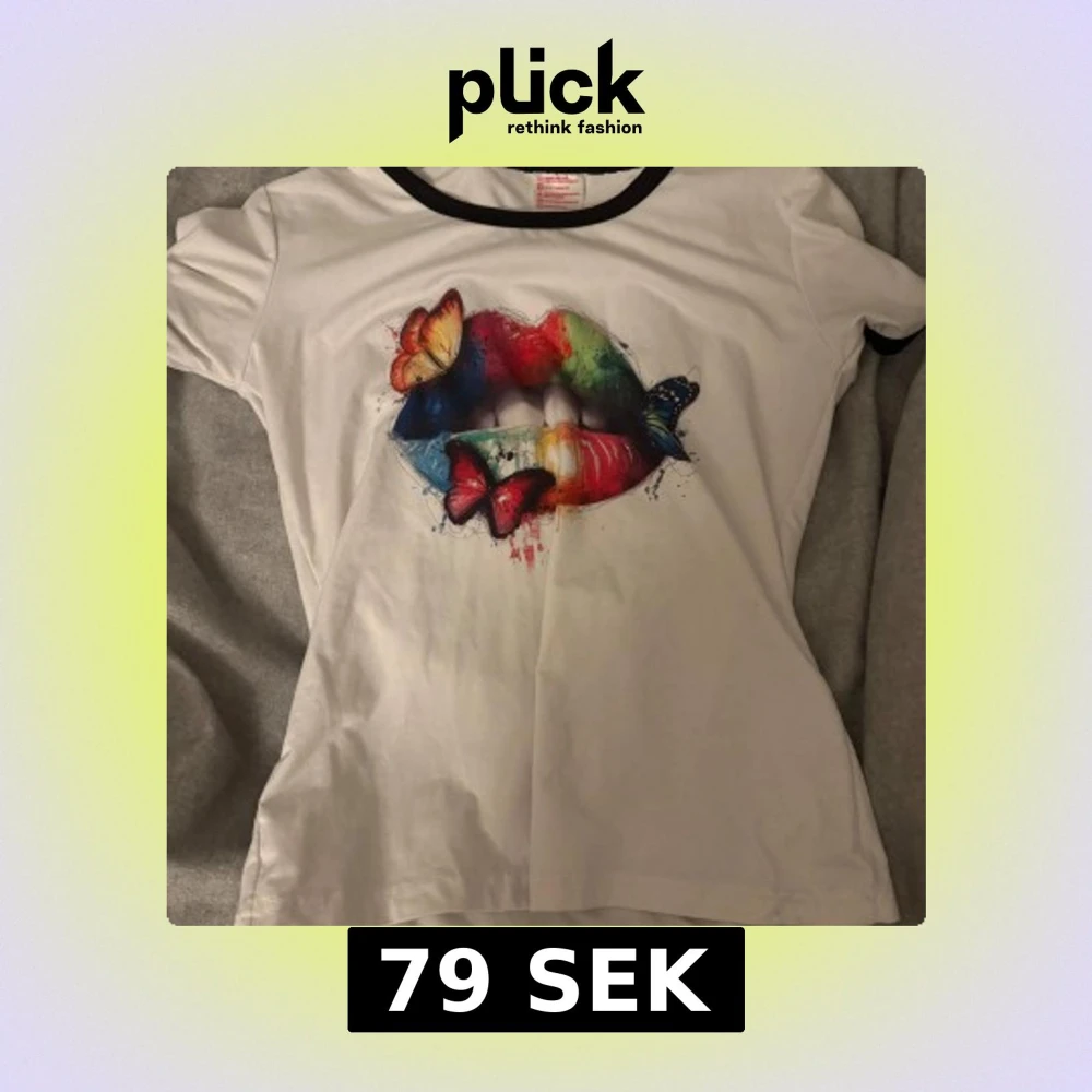 Säljer en vit t-shirt med ett coolt färgglatt tryck av läppar och fjärilar. T-shirten har svarta kanter vid halsen och är kortärmad. Perfekt för en färgstark look! 🌈🦋