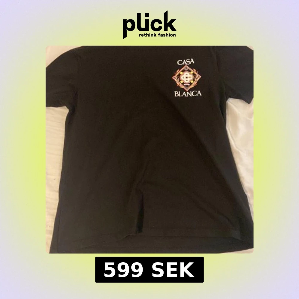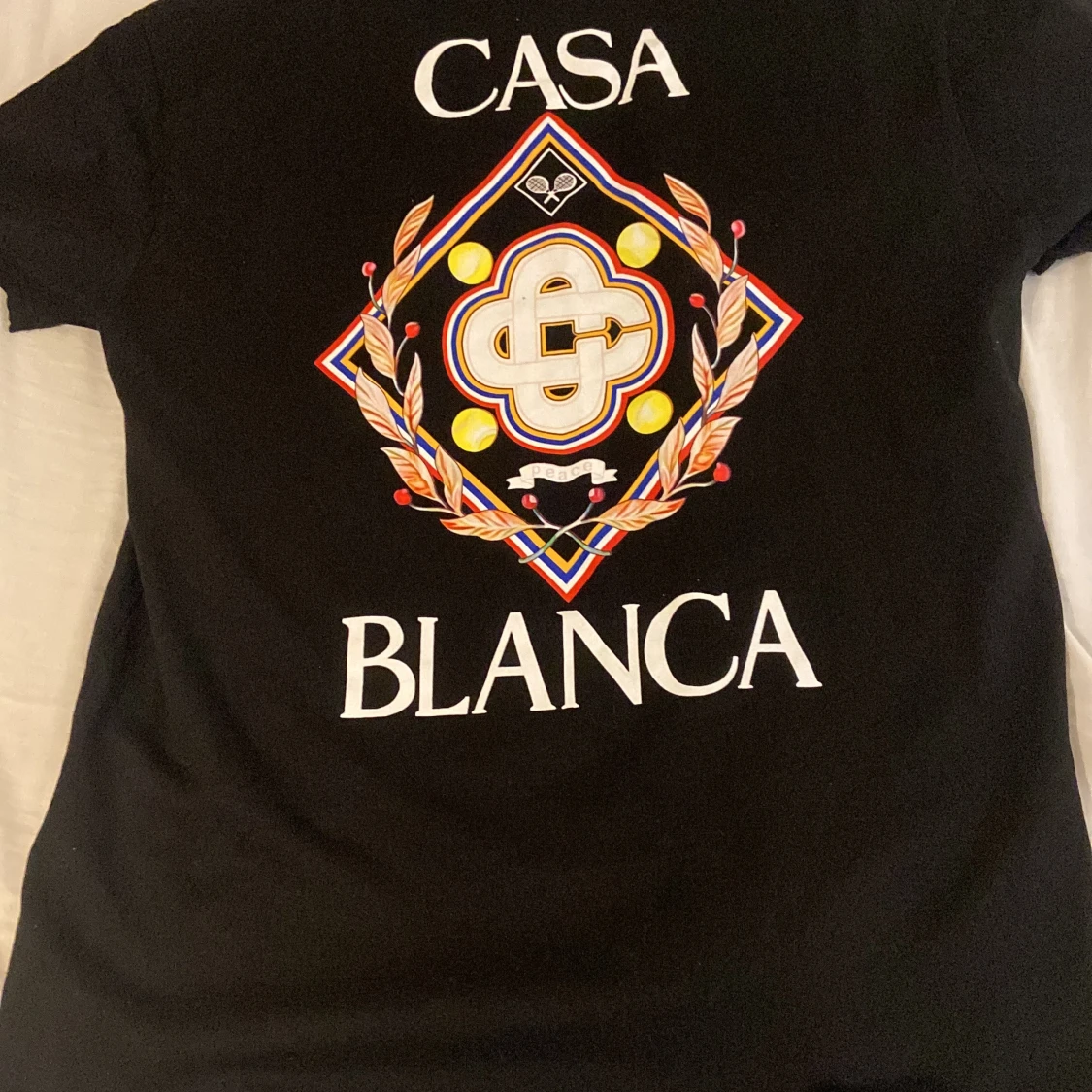 Svart t-shirt från Casablanca med stort färgglatt emblem-tryck och texten 'CASABLANCA' på både bröstet och ryggen. Klassisk passform och rund hals. Perfekt för dig som gillar streetwear med en exklusiv touch.