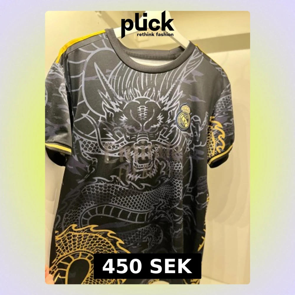 Unik Real Madrid fotbollströja med Ronaldo 7 på ryggen. Svart bas med detaljerat drakmönster i grått och guld, samt klubbmärke på bröstet. Gula ränder på axlar och ärmslut. Kortärmad och tillverkad i lätt polyester, perfekt för dig som vill sticka ut på planen.