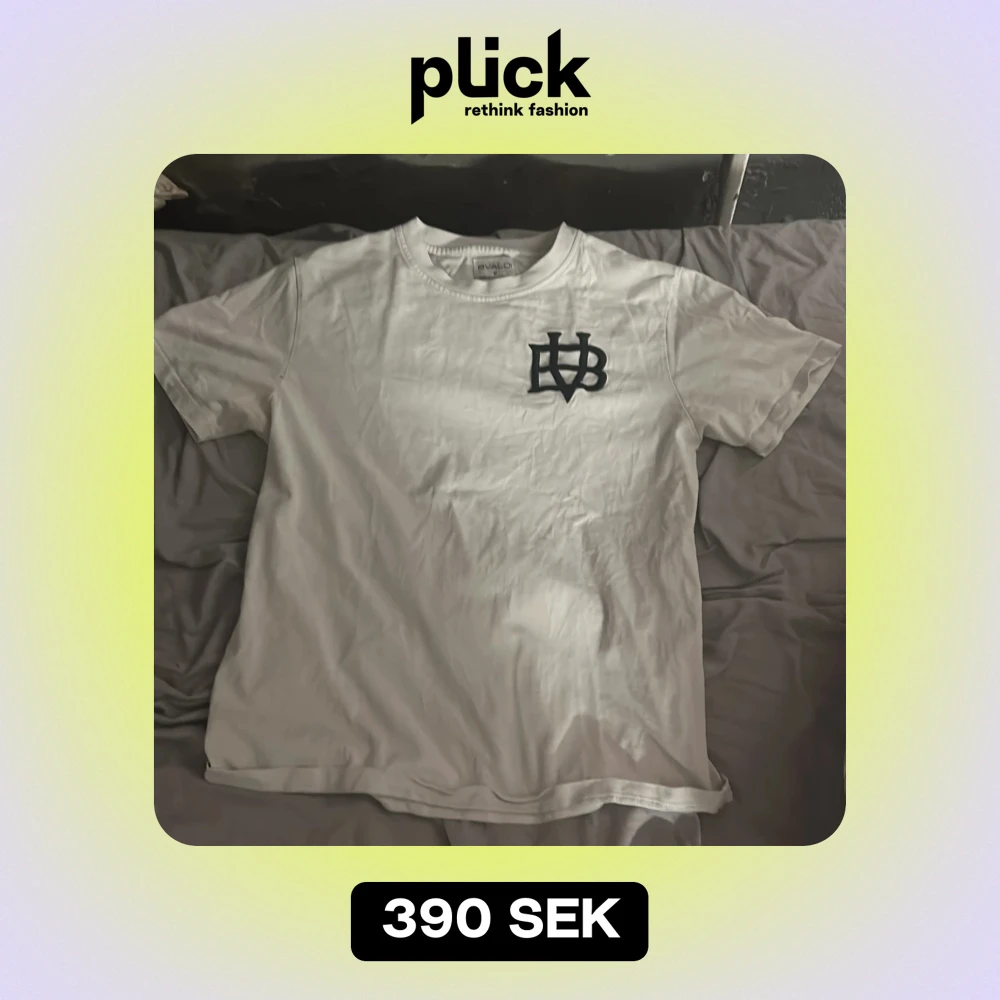Säljer en vit t-shirt från Bvaldi med ett svart broderat märke på bröstet. T-shirten är kortärmad och har en klassisk rund halsringning. Perfekt för en avslappnad stil. Använd 7 gånger max