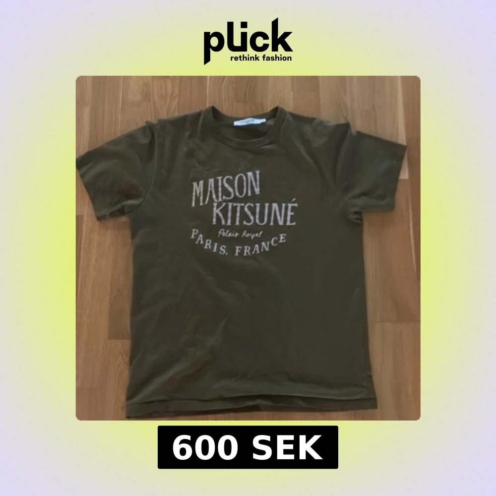 Snygg olivgrön t-shirt från Maison Kitsuné med vit tryckt text på bröstet. Klassisk rund hals och korta ärmar. Mjuk och skön i bomull, perfekt för dig som gillar stilrena och trendiga plagg med fransk vibe. Nyskick