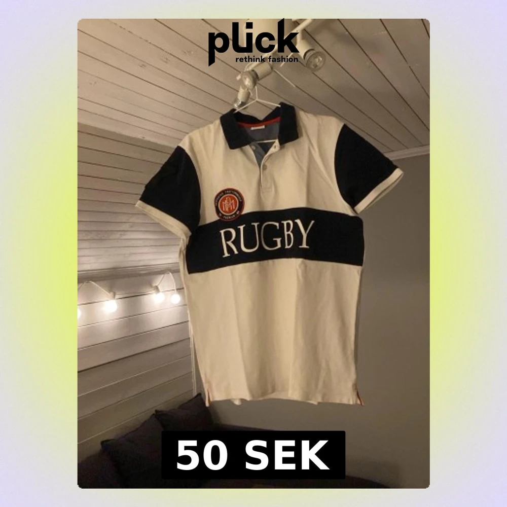 Snygg t-shirt i vit och marinblå med klassisk krage och knappslå. Stor text 'RUGBY' över bröstet och ett broderat märke på vänster sida. Perfekt för dig som gillar sportig stil och vill sticka ut.