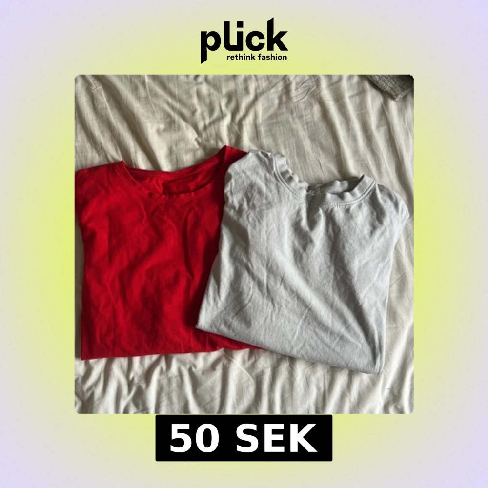 Två basic t-shirts i storlek M: en röd långärmad och en grå kortärmad. Båda har rund halsringning och är gjorda i mjuk bomull. Perfekta att matcha med jeans eller shorts för en clean och enkel look.