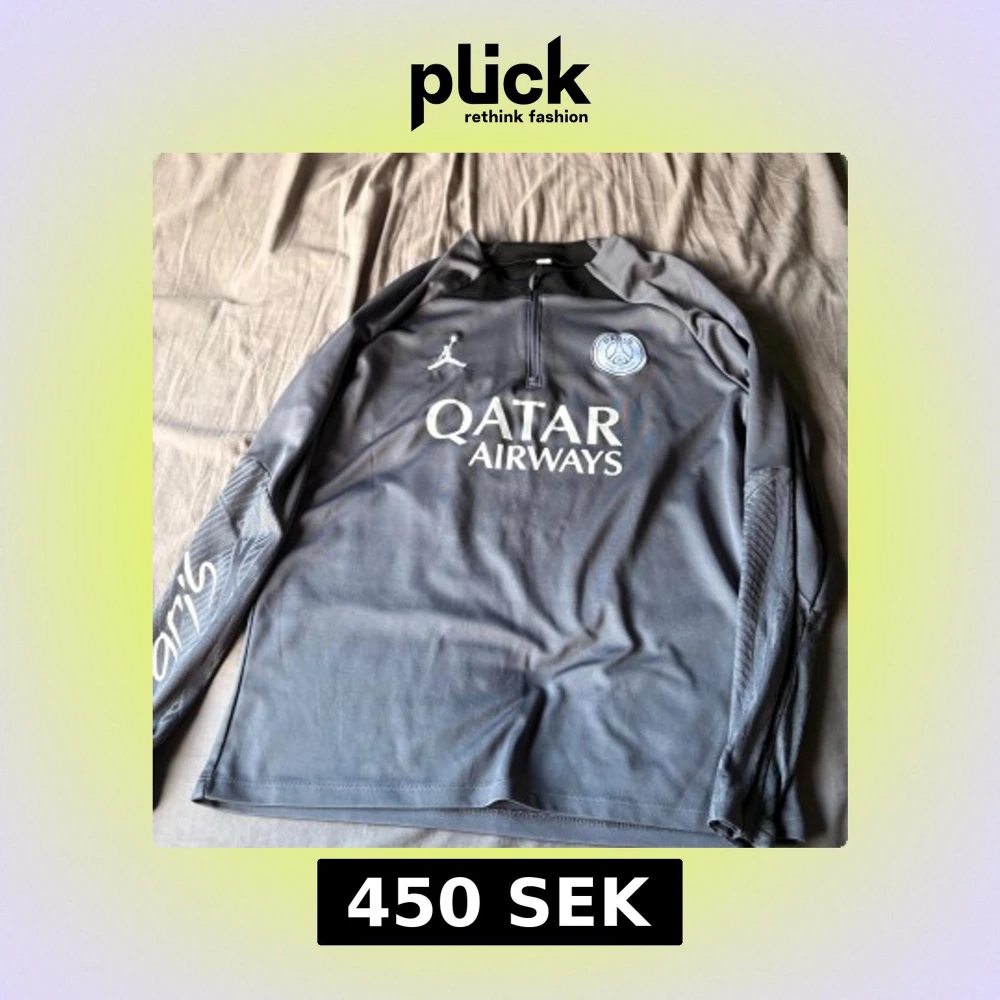 Snygg långärmad fotbollströja från PSG i samarbete med Jordan. Tröjan är grå med svarta detaljer, halv dragkedja och tryckta loggor på bröstet samt 'Paris' på ärmen. Tillverkad i lätt och funktionellt material, perfekt för träning eller match.