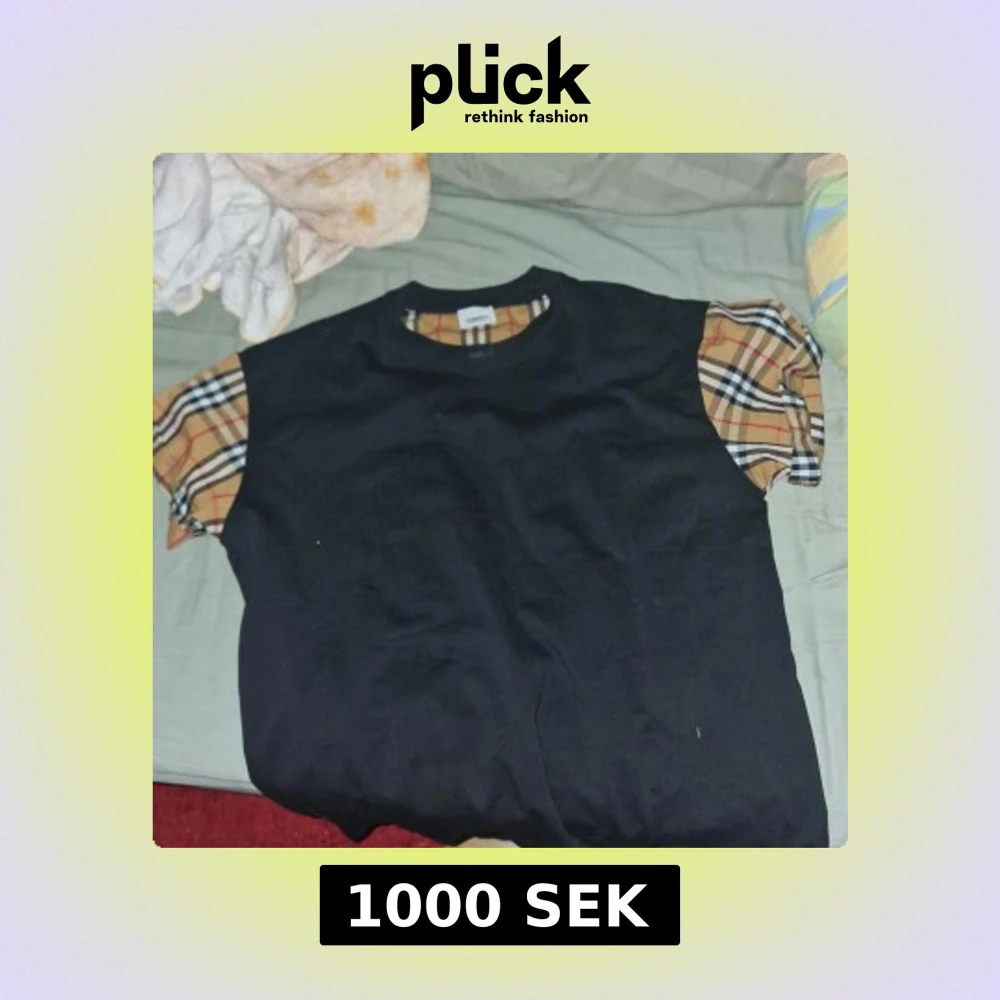 Säljer en svart t-shirt med korta ärmar i klassiskt beige, svart och röd rutig design. T-shirten har rund halsringning och en unik kontrast mellan enfärgad front och mönstrade ärmar. Perfekt för dig som vill sticka ut lite extra.