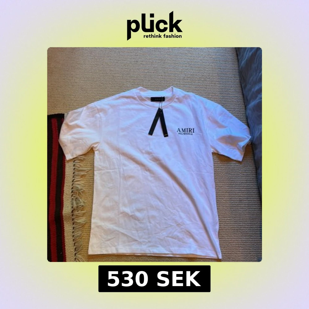 Säljer en vit t-shirt från Amiri med svart tryck på bröstet och ett stort grafiskt tryck på ryggen. Klassisk rund hals och korta ärmar. Perfekt för dig som gillar streetwear och vill ha något stilrent men ändå med edge. Pris kan diskuteras, original förpackning kommer med! Skulle säga att den passar M också