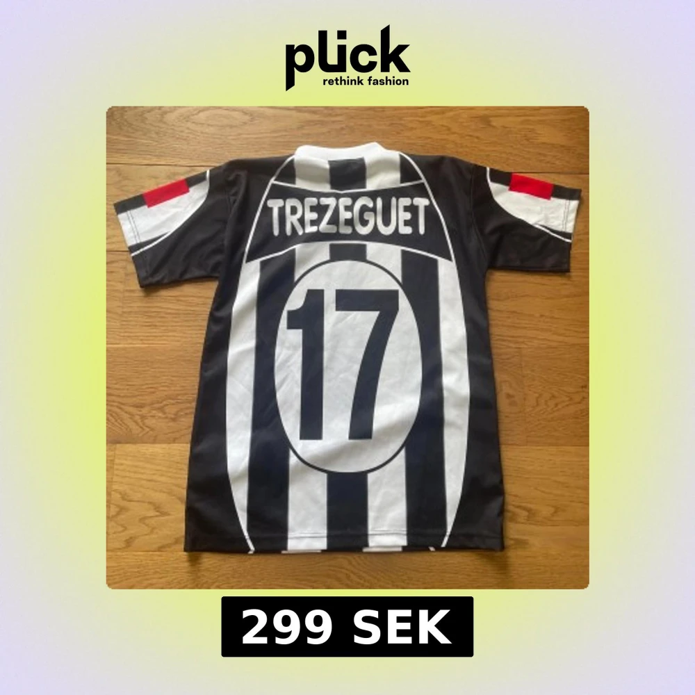 Juventus officiella matchtröja med Trezeguet och nummer 17 på ryggen. Svart och vit med breda vertikala ränder, klubbmärke och sponsortryck på bröstet samt italienska mästerskapsmärket. Kortärmad, V-ringad krage och detaljer i rött på ärmarna. Tillverkad i polyester.