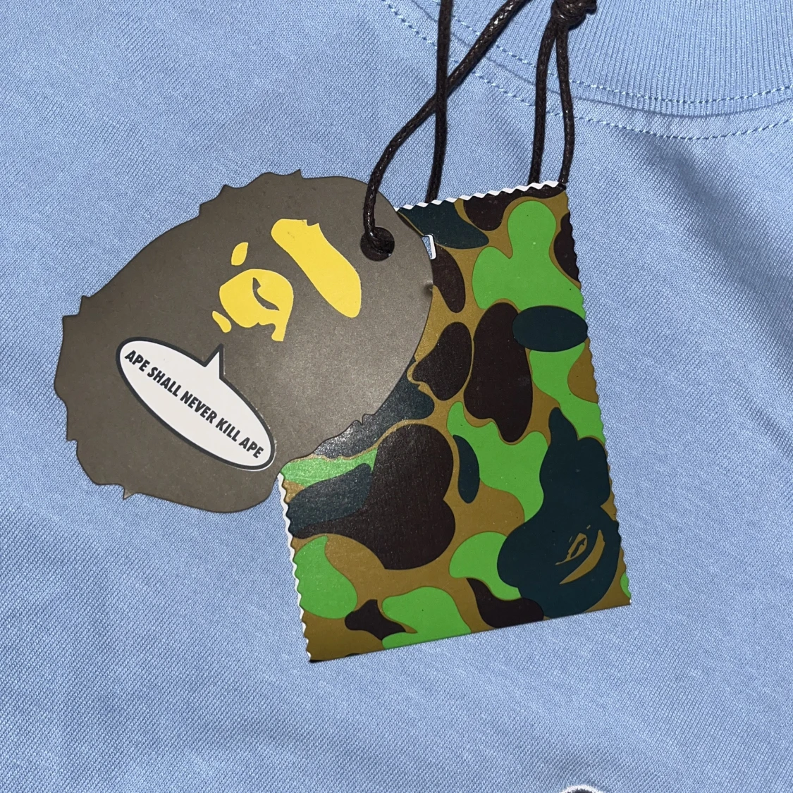 Säljer en snygg blå t-shirt från A Bathing Ape med det ikoniska apansikte-logotypen broderad på bröstet. T-shirten har en normal passform och korta ärmar. Perfekt för en stilren och avslappnad look.