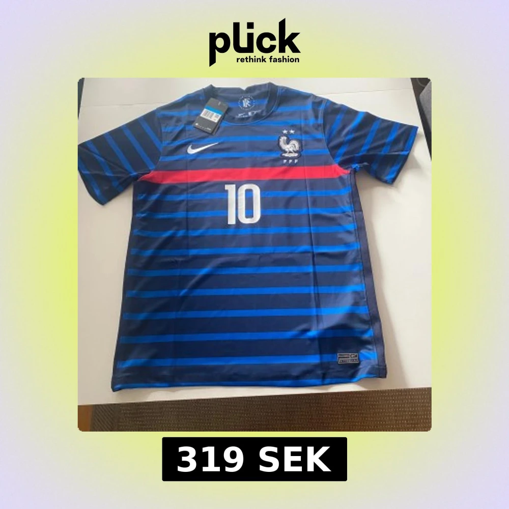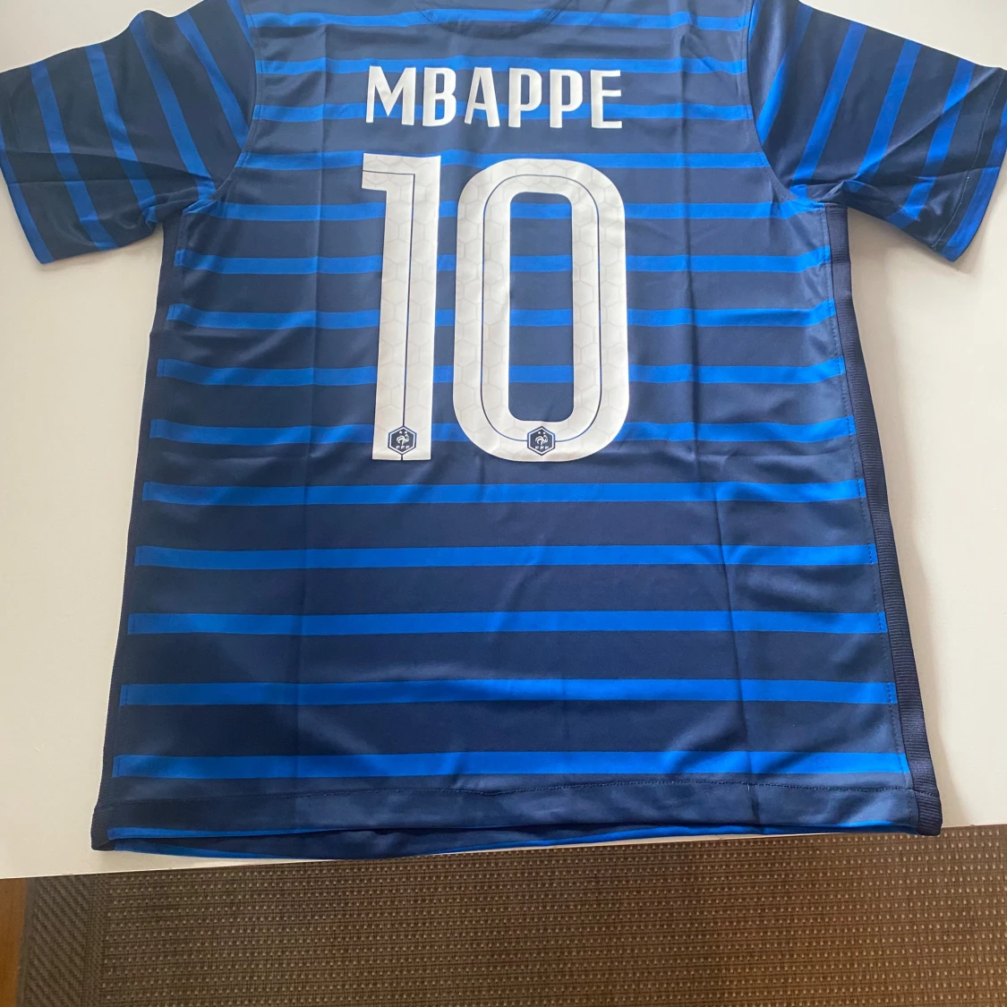 Snygg blå fotbollströja med Frankrikes landslagsmärke, nummer 10 och Mbappé på ryggen. Tröjan har horisontella ränder i olika blå nyanser och en röd detalj över bröstet. Tillverkad i lätt och ventilerande material, perfekt för match eller träning.