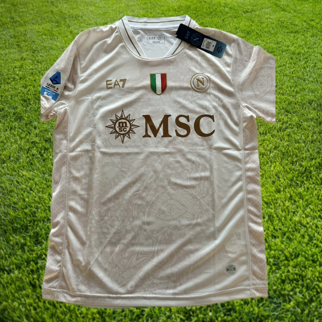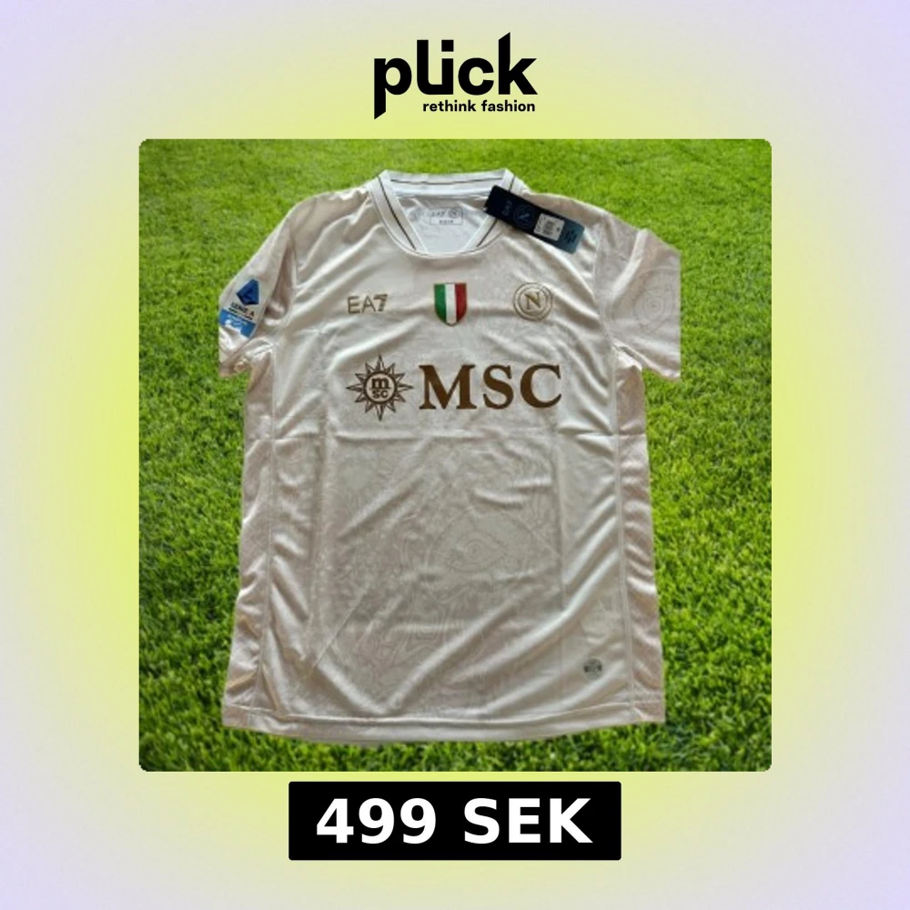 Nyskick/helt oanvänd Napoli bortatröja från denna säsong, 2025/2026. Den har flera tryck på framsida, ärmar och även baksida. Det fina Napoli och EA7 i guldfärg glänser irl väldigt fint. Tveka inte att höra av er för fler frågor och bilder!