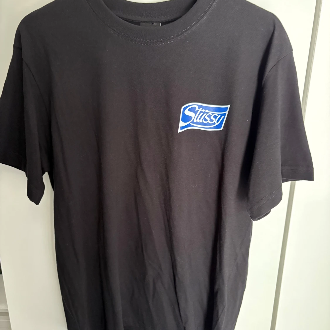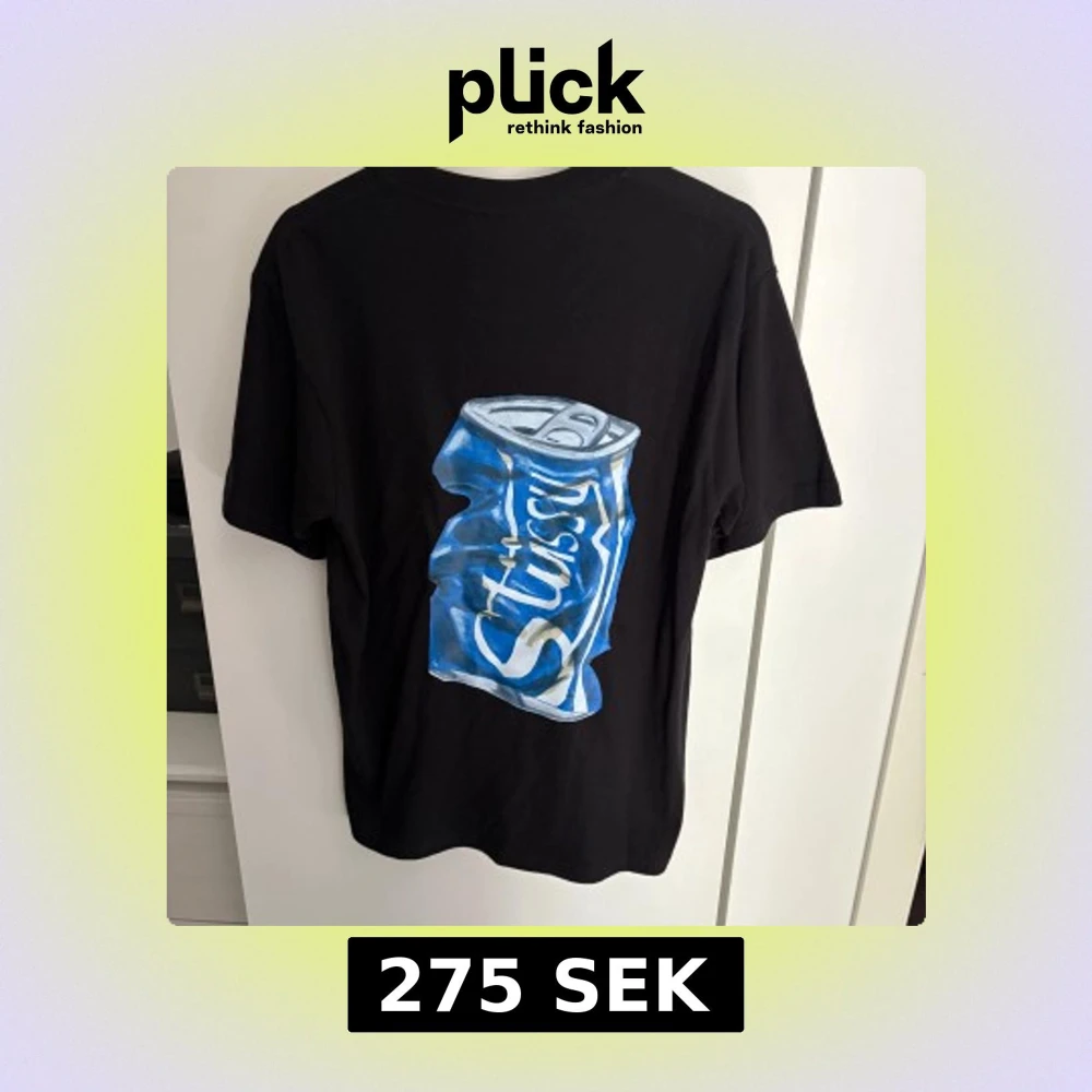 Svart t-shirt från Stüssy i bomull med coolt tryck av en blå krossad läskburk på ryggen och Stüssy-logga på bröstet. Klassisk rund hals och korta ärmar.
