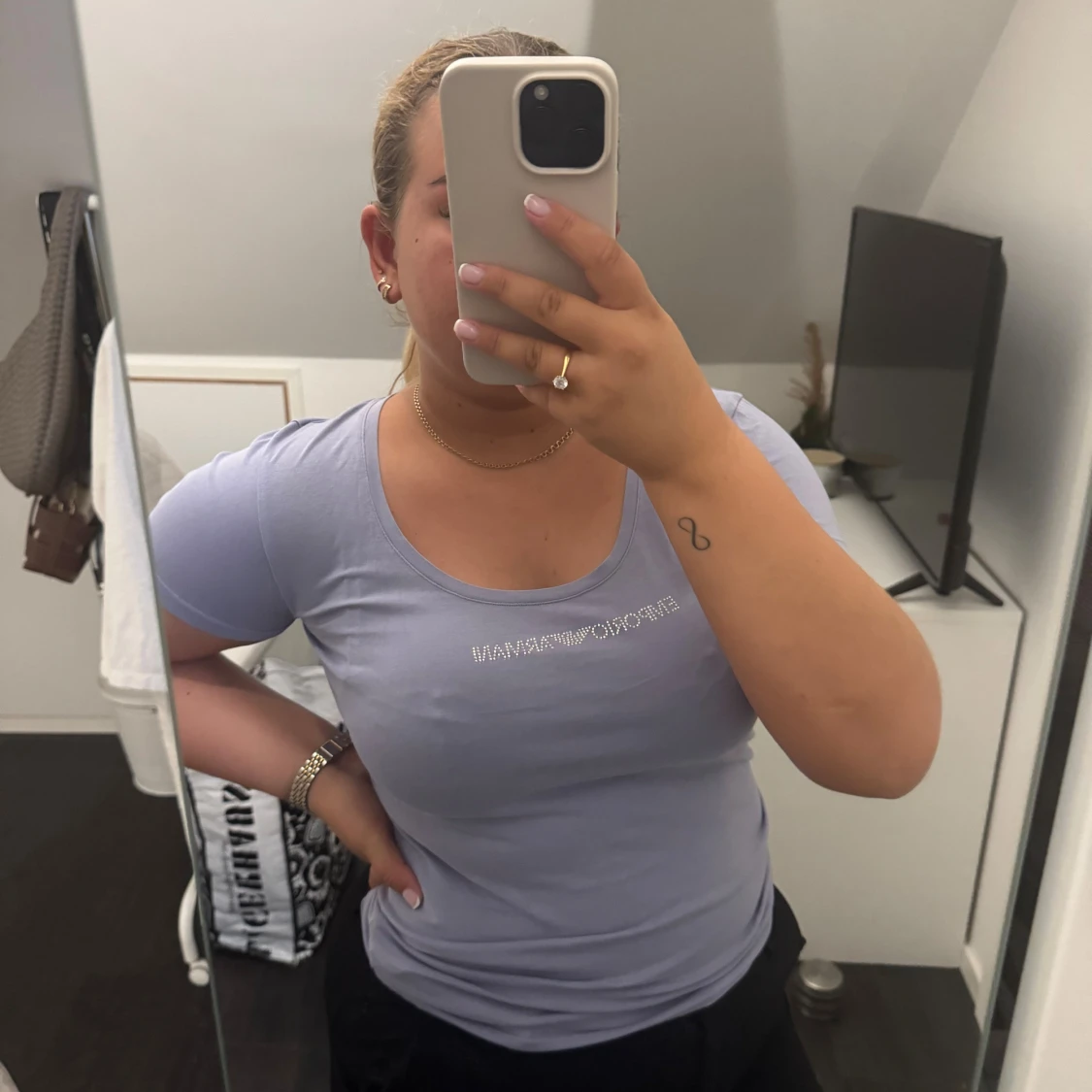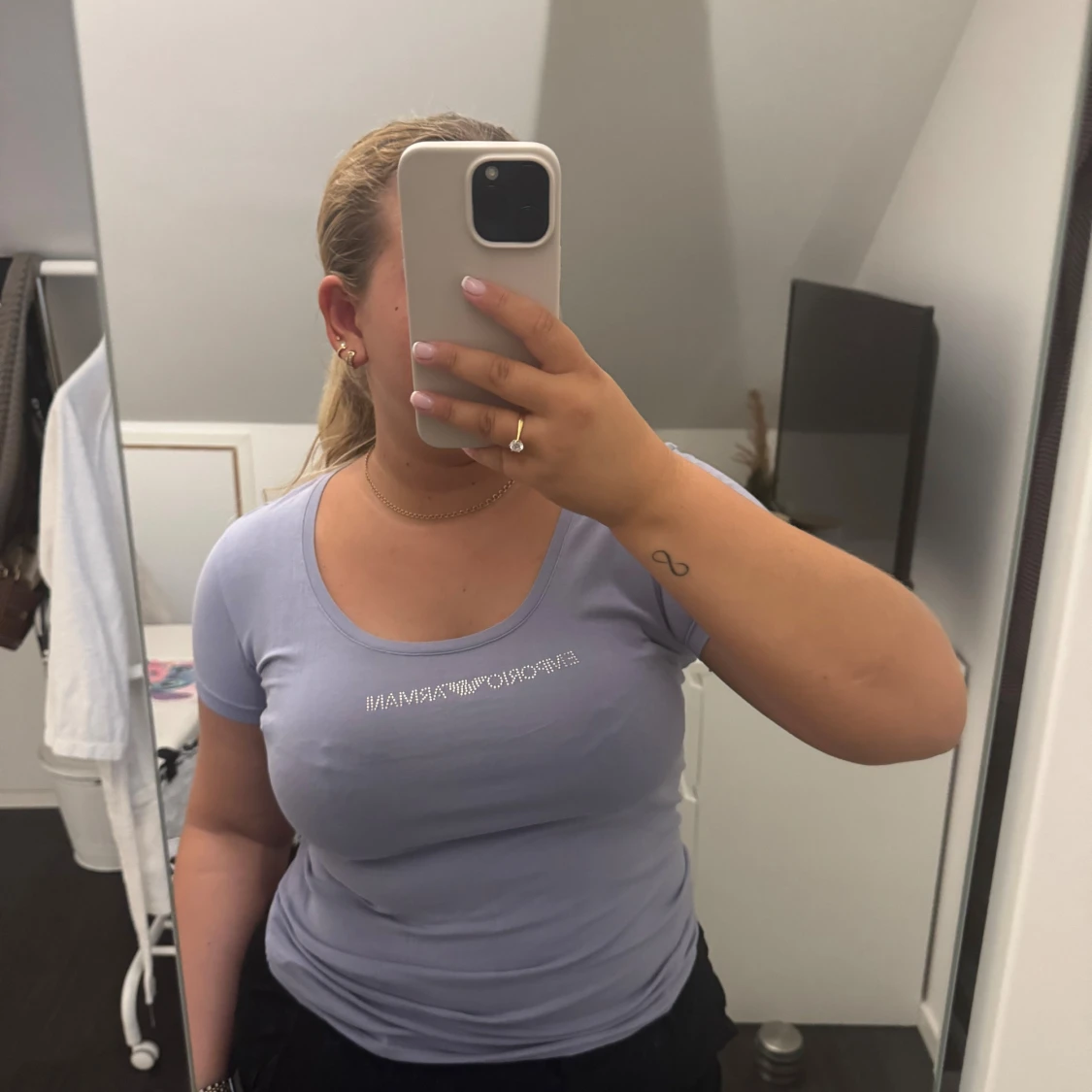 Snygg ljuslila t-shirt från Emporio Armani med rund halsringning och korta ärmar. T-shirten har ett glittrigt Emporio Armani-tryck framtill och är gjord i mjuk bomull som sitter skönt mot kroppen. Perfekt för dig som gillar stilrena och trendiga plagg. Toppen är i mycket fint skick, några stenar har gått av men inget som syns eller märks av.