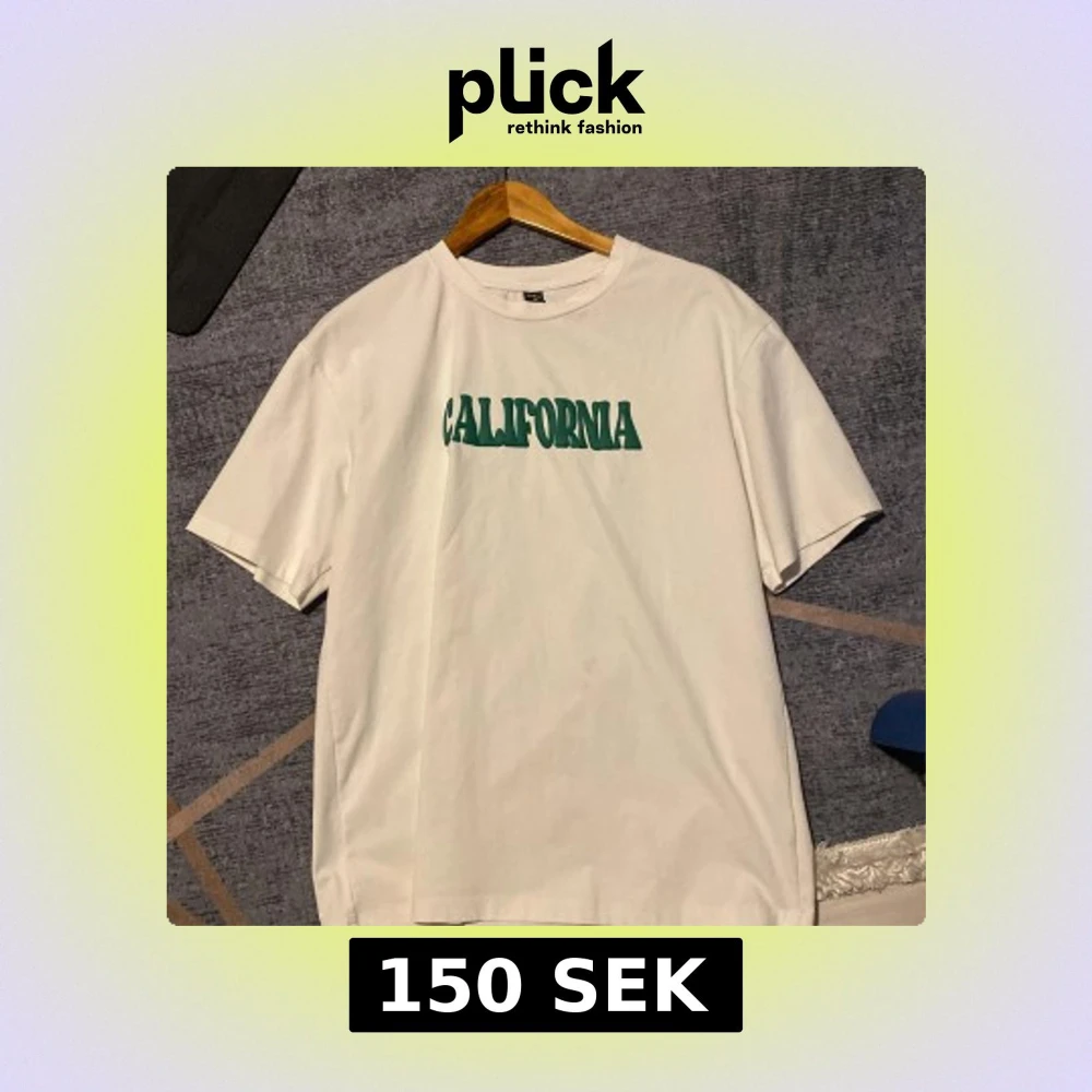 Vit t-shirt från SHEIN i storlek M med coolt grönt tryck 'CALIFORNIA' på bröstet. Klassisk passform med rund hals och korta ärmar. Perfekt för en avslappnad streetstyle-look.