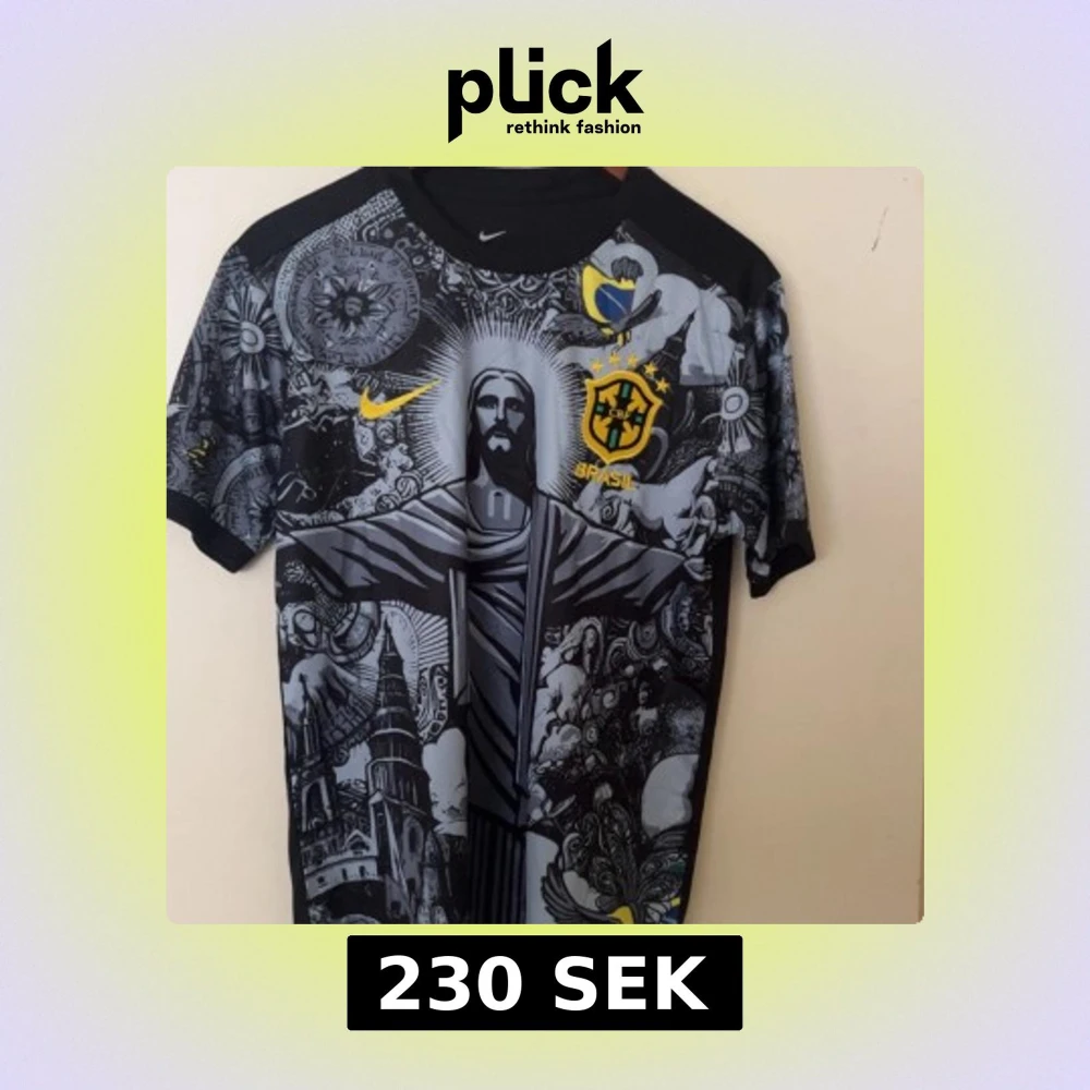Unik svart fotbollströja med grått och gult tryck. Framsidan har detaljerad grafik med Kristusstatyn, kyrka och konstnärliga mönster. Gult märke och logga på bröstet. Korta ärmar med tryck, baksidan är enkel med emblem.