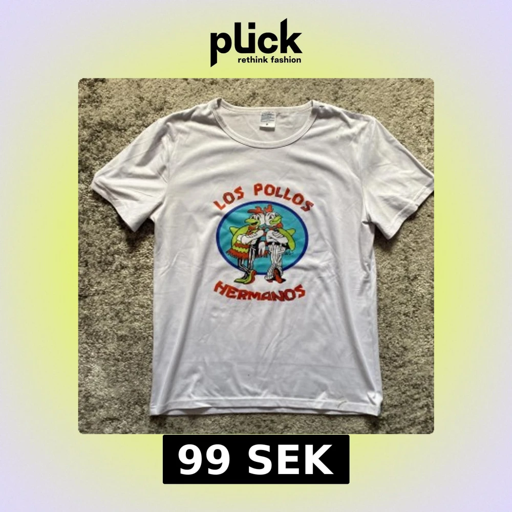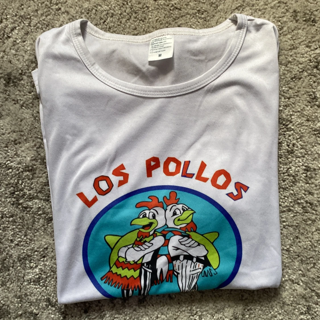 Vit t-shirt med färgglatt Los Pollos Hermanos-tryck på bröstet. Motiv med två tecknade kycklingar i cirkel, röd text och detaljer i blått, grönt och orange. Rund hals och korta ärmar. Tillverkad i mjuk bomull, perfekt för dig som gillar popkultur och unika prints.