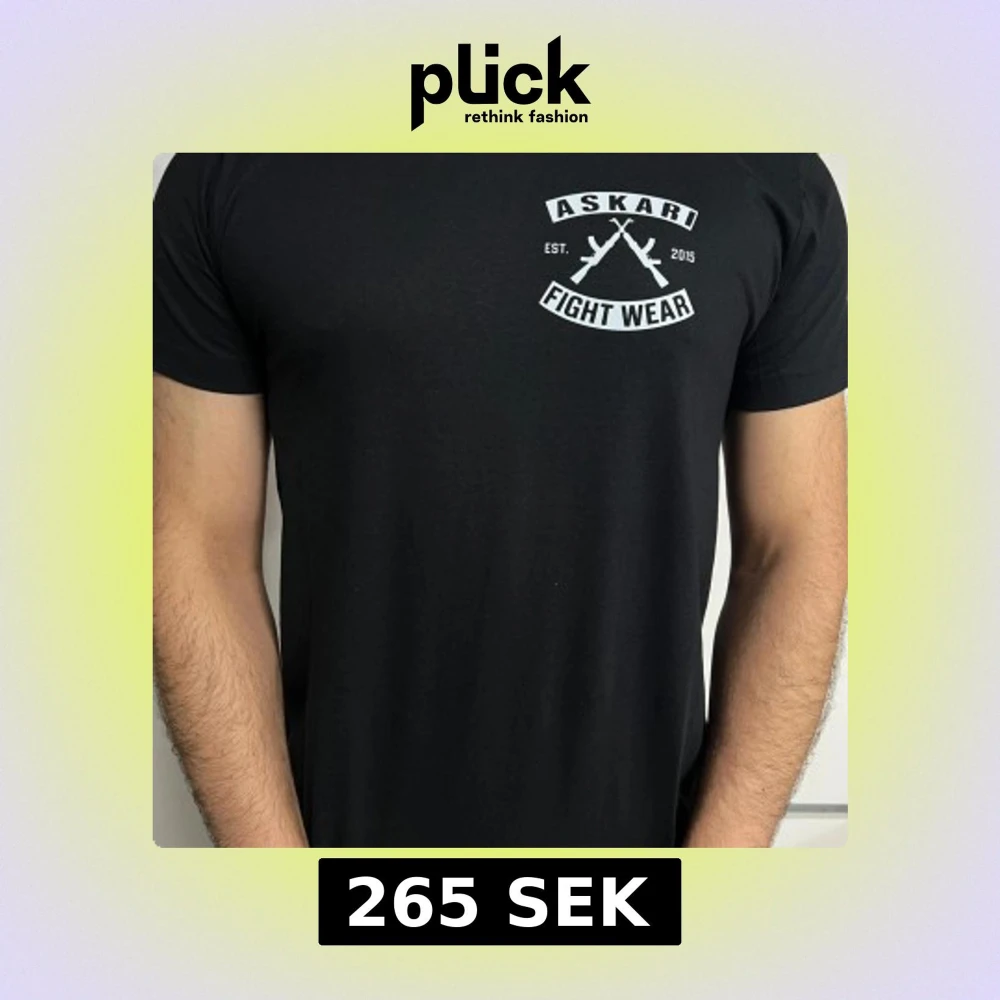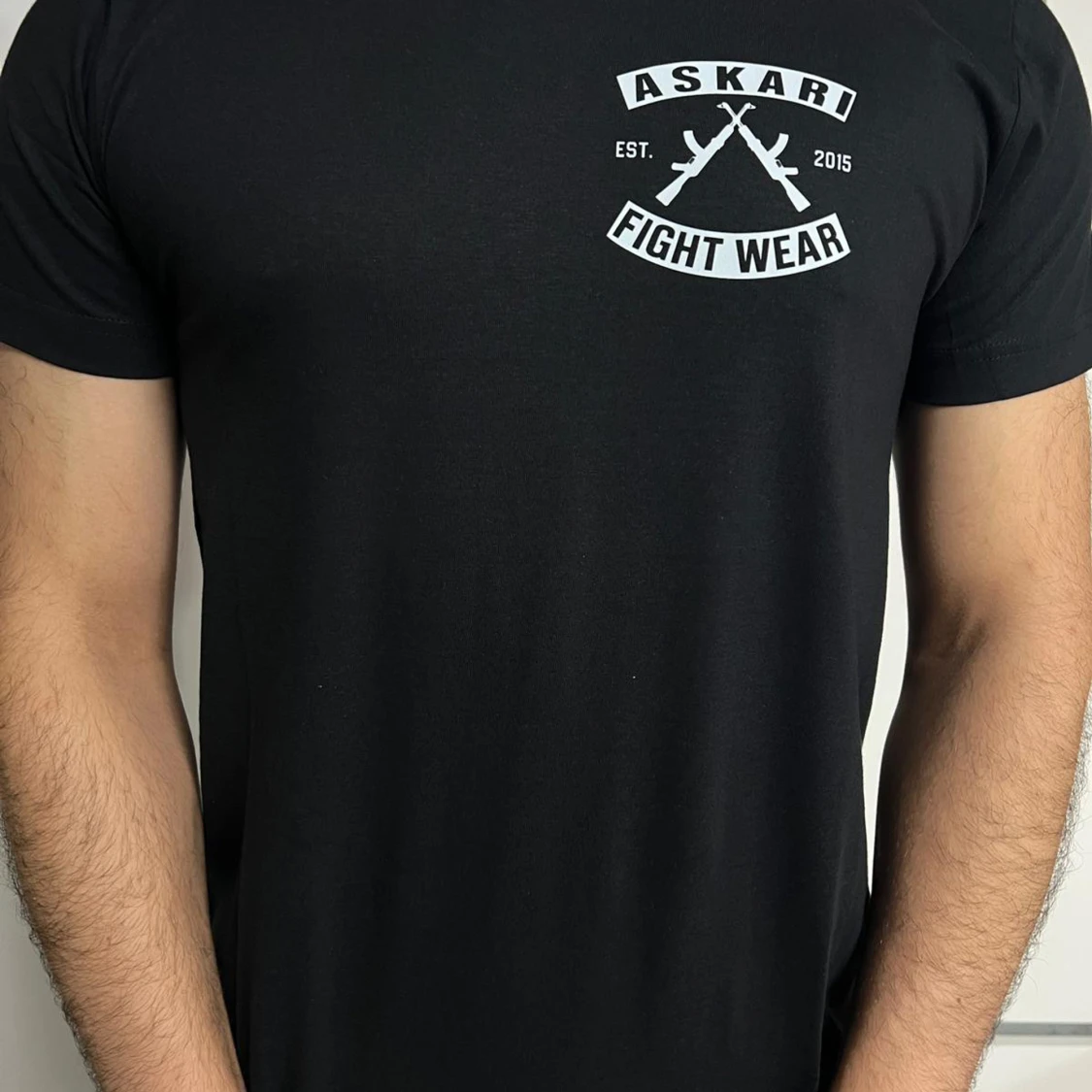 Svart t-shirt från Askari Fight Wear med stort vitt tryck både fram och bak. Trycket har texten 'ASKARI FIGHT WEAR' och två korsade gevär. Klassisk passform och rund hals, perfekt för dig som gillar streetwear och kampsport.