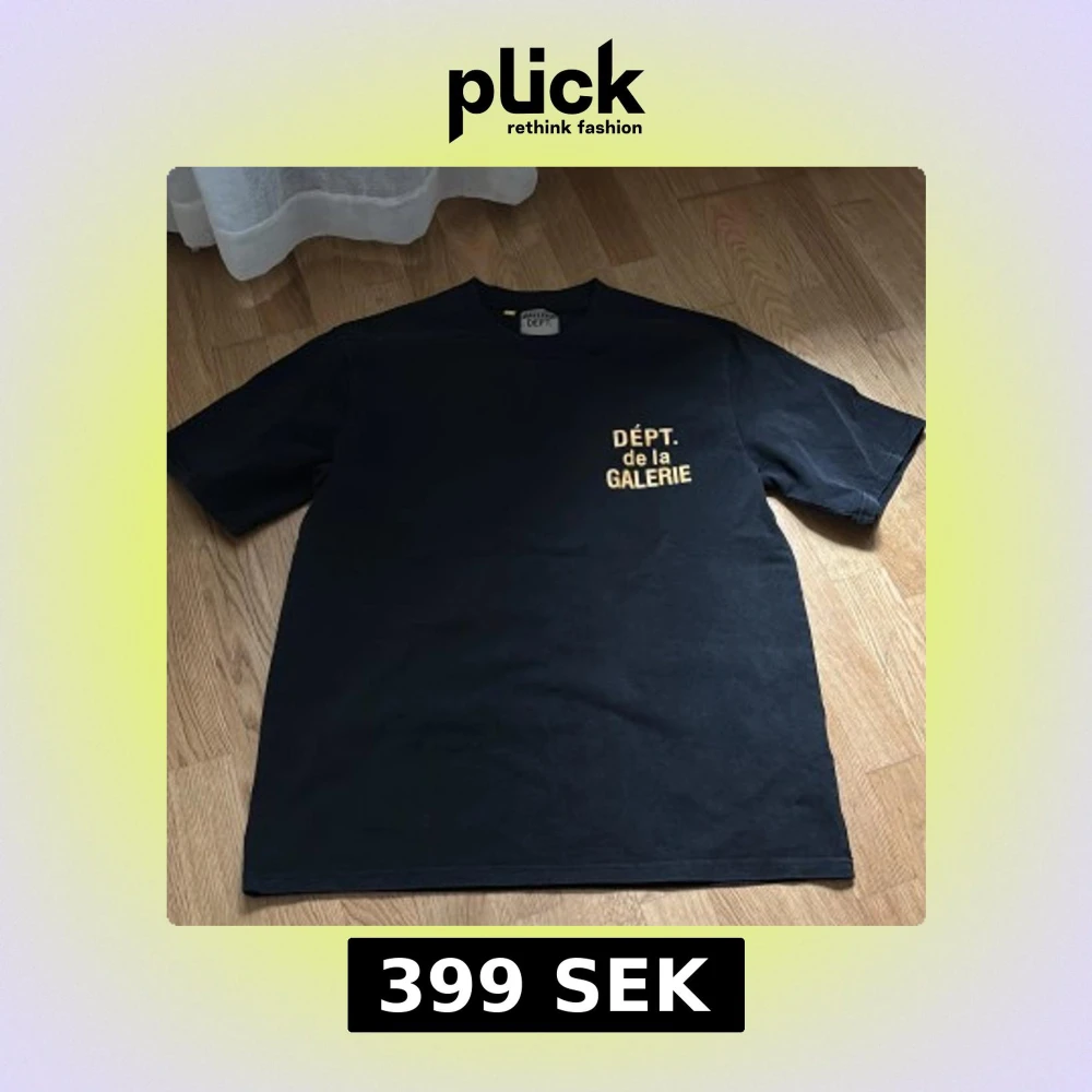 Svart t-shirt från Gallery Dept. med gul text 'DÉPT. de la GALERIE' tryckt på bröstet och i större format på ryggen. Klassisk passform och rund halsringning. Tillverkad i 100% bomull för en skön känsla. Den är även helt oanvänd. Vill inte ha den eftersom den är inte i min storlek. ⚠️1:1⚠️
