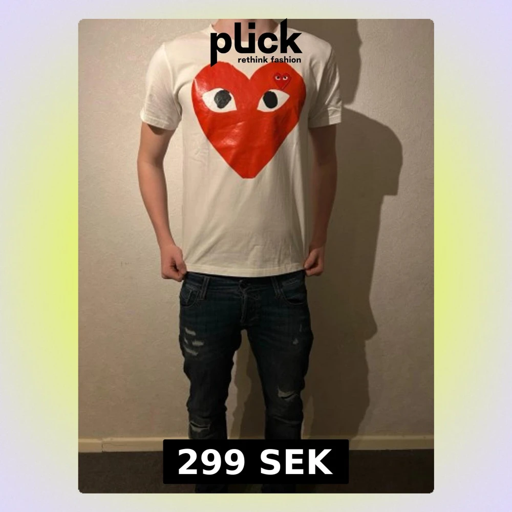 Vit t-shirt från Comme des Garçons Play med det ikoniska stora röda hjärtat med ögon tryckt på bröstet. Klassisk rund hals och korta ärmar. Tillverkad i mjuk bomull för en skön känsla och normal passform. Har kvar lapp