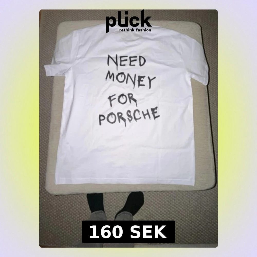 Säljer en vit T-shirt från med svart text på ryggen där det står 'NEED MONEY FOR POR$CHE' i handskriven stil. Klassisk passform med rund hals och korta ärmar. Tillverkad i mjuk bomull och har en tagg kvar i nacken.