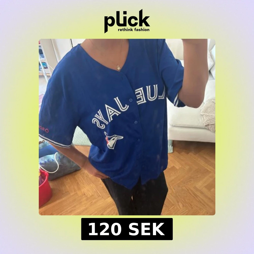 Säljer en blå Blue Jays supportertröja med tryck fram och bak. På framsidan står det 'Blue Jays' med lagets logga och på ryggen står det 'Martin 55' i vitt. Tröjan har korta ärmar, knappar framtill och är gjord i ett lätt, sportigt material.