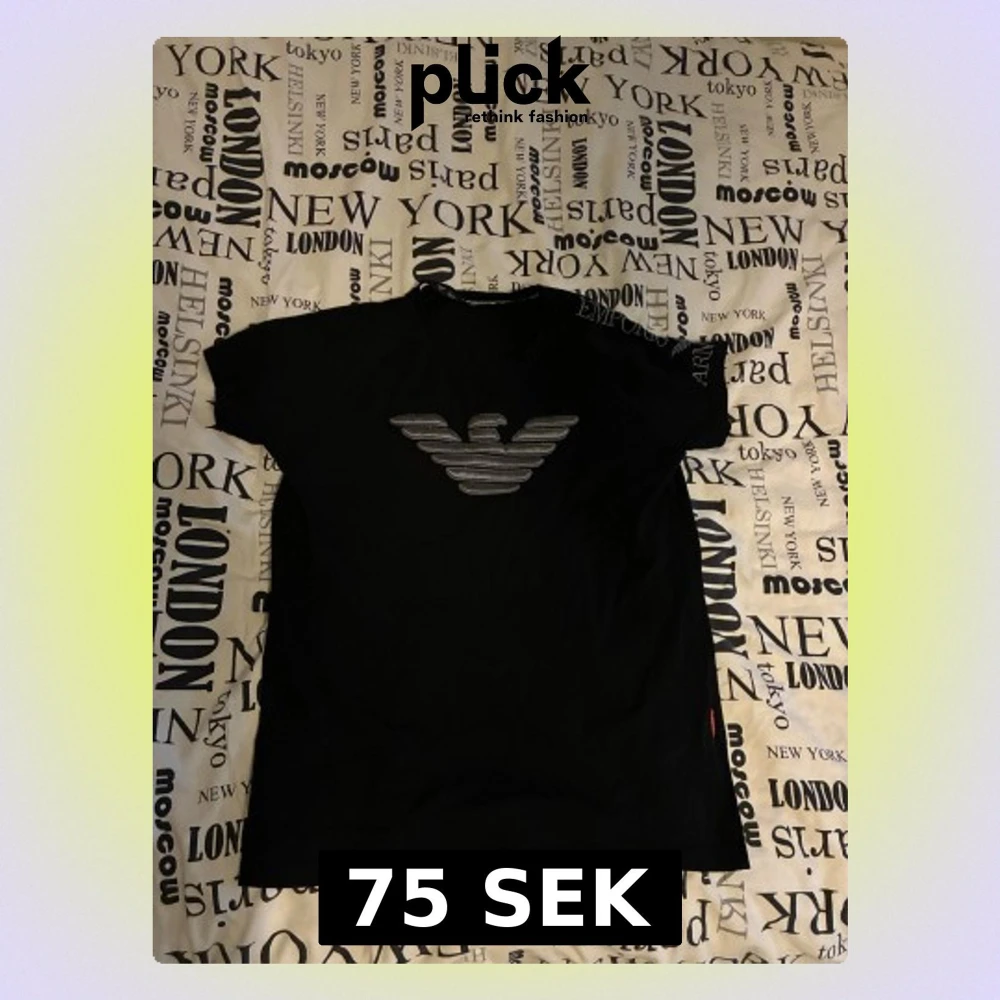 Svart t-shirt från Emporio Armani i storlek M med klassisk rund hals och korta ärmar. Framtill finns det ikoniska Armani-logotypen i silver. Materialet är mjuk bomull som känns skönt mot huden. Perfekt för dig som gillar stilrena designer och exklusiva märken.