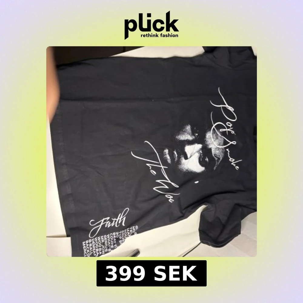 Svart t-shirt med vit tryck från Pop Smoke. Framsidan har ett stort porträtt av Pop Smoke, hans signatur och texten 'Faith'. Baksidan har ett coolt rök-motiv i vitt. Tryck med låttitlar nertill. Klassisk passform och rund hals. Perfekt för dig som gillar streetwear och hiphop.