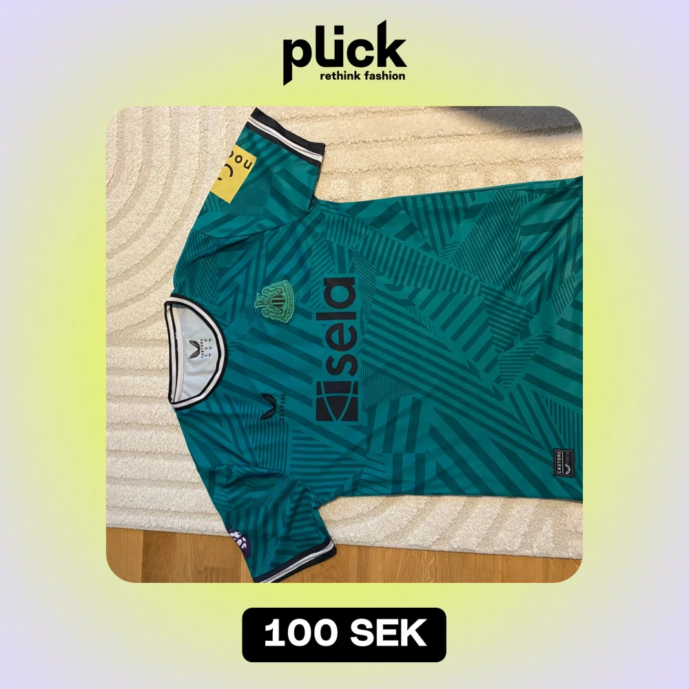 Säljer en grön fotbollströja med ett coolt geometriskt mönster. Tröjan har korta ärmar och en rund halsringning med svart och vit kant. Märket Sela syns tydligt på framsidan. Perfekt för fotbollsfans som vill sticka ut på planen!
