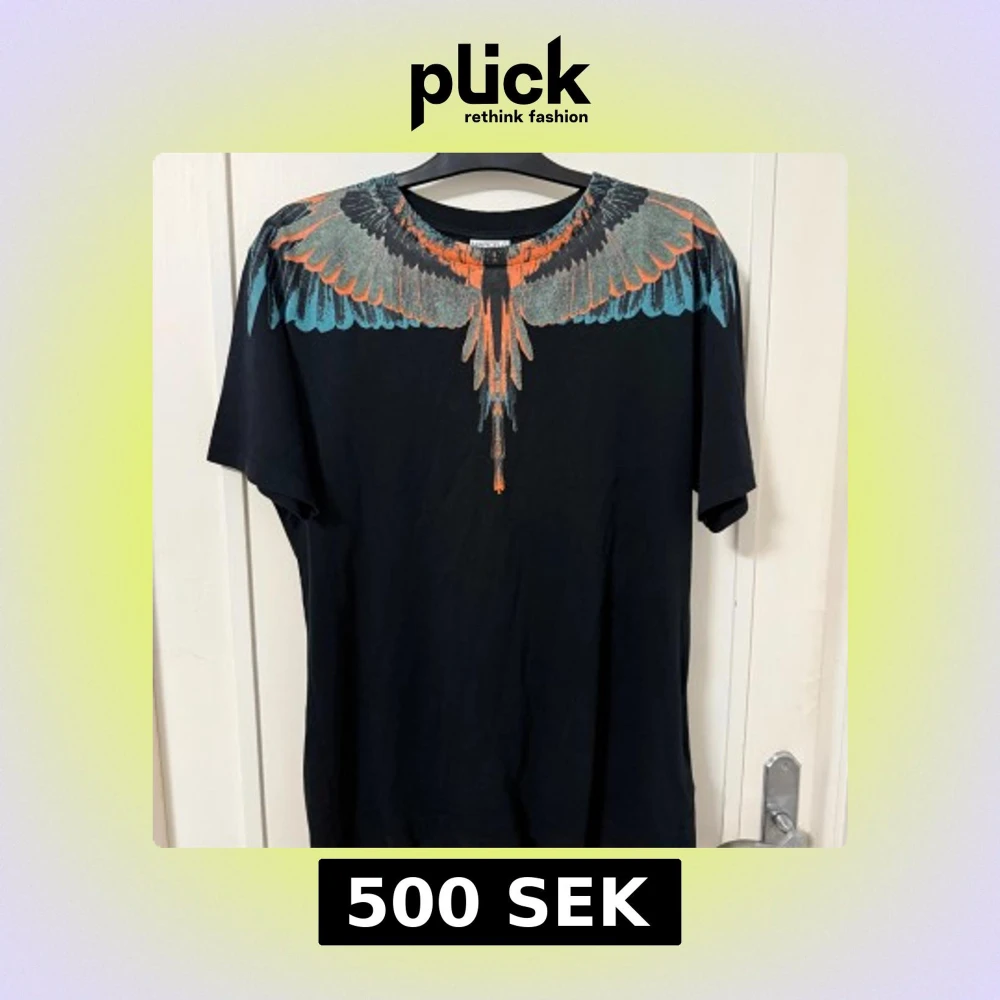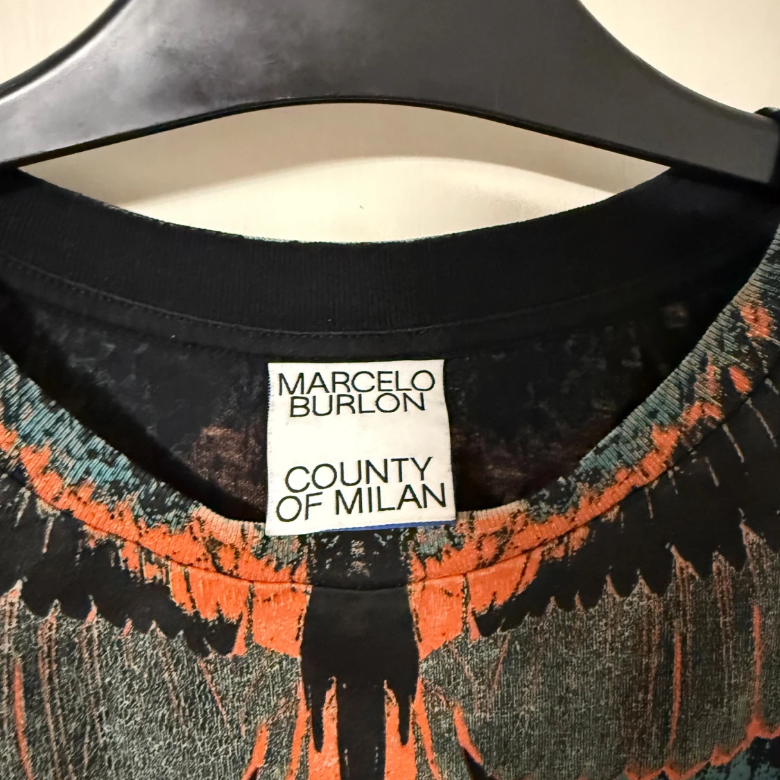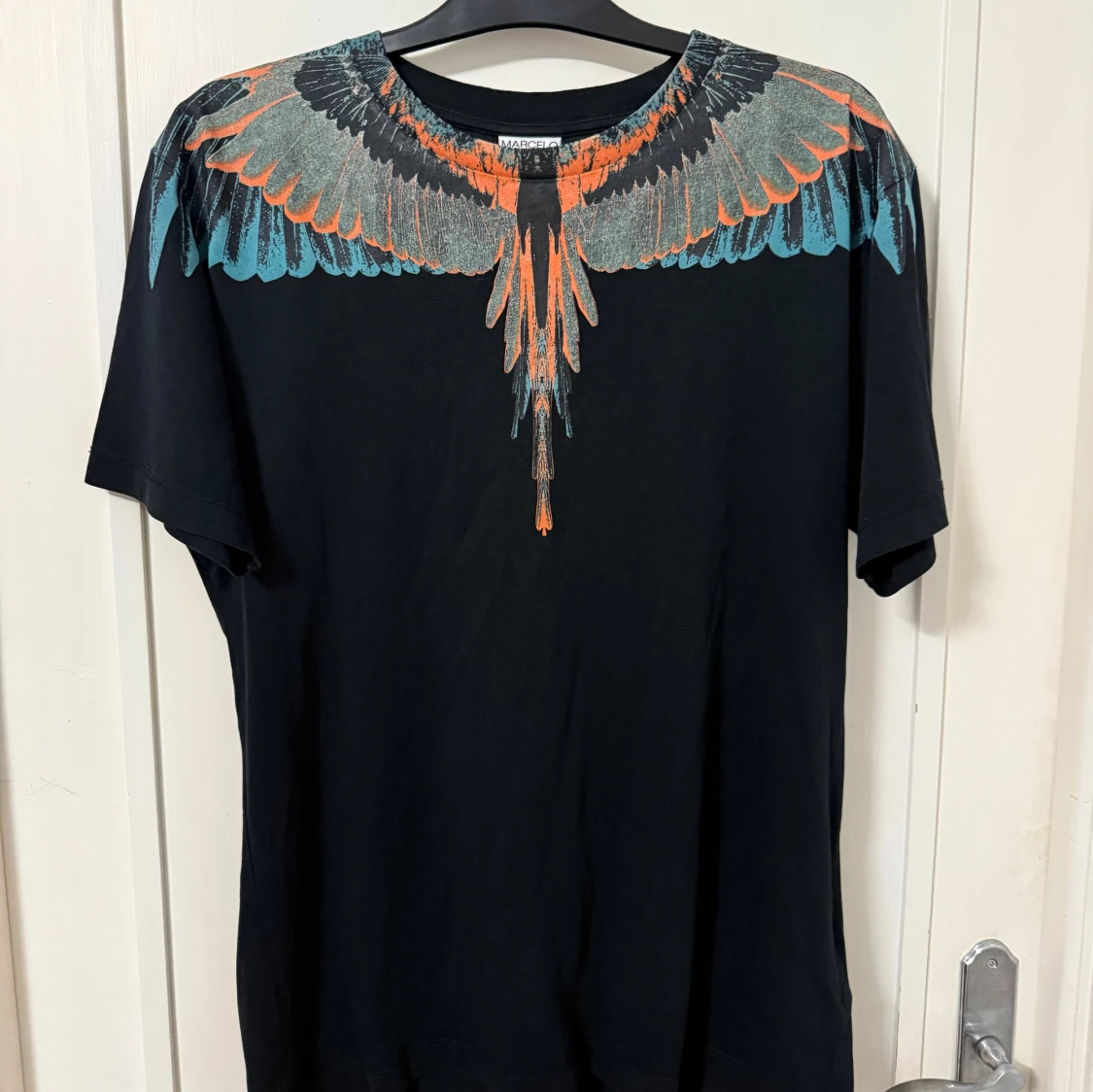 Svart t-shirt från Marcelo Burlon County of Milan med ett fett fågeltryck i orange, blått och grått över axlar och hals. Modellen är klassisk med rund hals och korta ärmar. Materialet är mjuk bomull som känns skön mot huden.