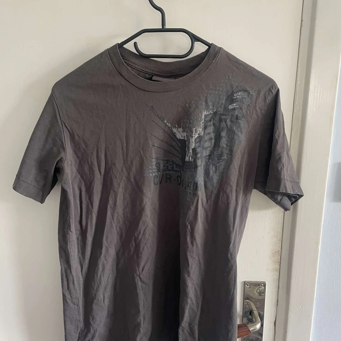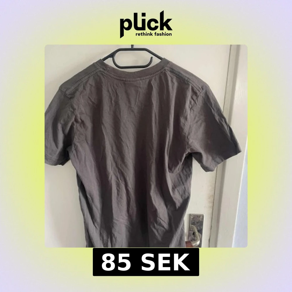 Säljer en mörkbrun t-shirt med ett diskret tryck framtill. T-shirten har rund halsringning och är tillverkad i mjuk bomull. Perfekt för en avslappnad stil.