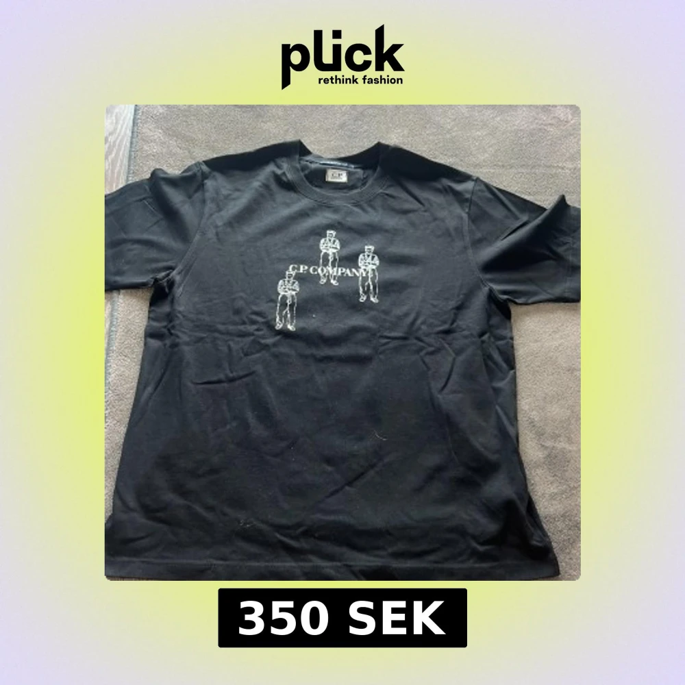 Säljer en svart t-shirt från C.P. Company med tryck av sittande figurer och logga på både fram- och baksida. Klassisk rund hals och korta ärmar. Perfekt för dig som gillar streetwear och vill ha något stilrent men ändå unikt.