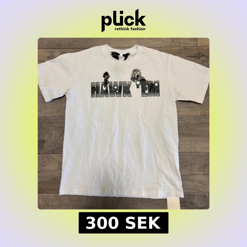 Säljer en vit t-shirt från VLONE med trycket 'HAWK 'EM' i svart och grått på framsidan och en stor V med blå detaljer på ryggen. T-shirten är i bomull och har en normal passform med klassisk rund hals och korta ärmar. Perfekt för dig som gillar streetwear och unika prints.