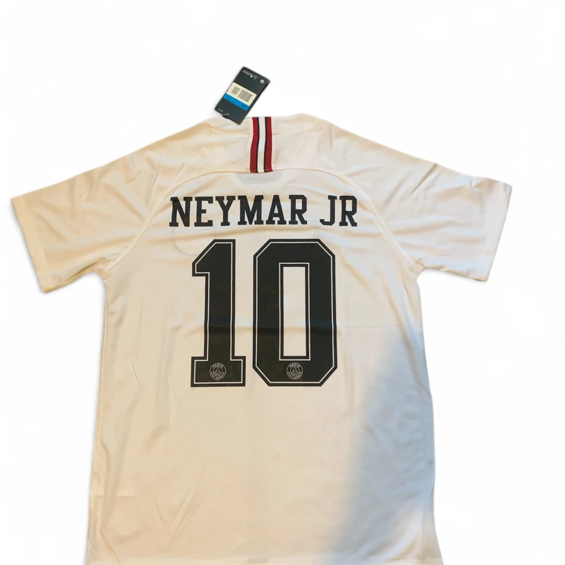 Säljer en vit PSG fotbollströja med Neymar Jr och nummer 10 på ryggen. Tröjan har svart tryck, Fly Emirates sponsor, PSG-emblem och Jordan-logga på bröstet. Kortärmad modell i lätt och ventilerande material, med en diskret vertikal rand framtill och röda detaljer vid nacken.