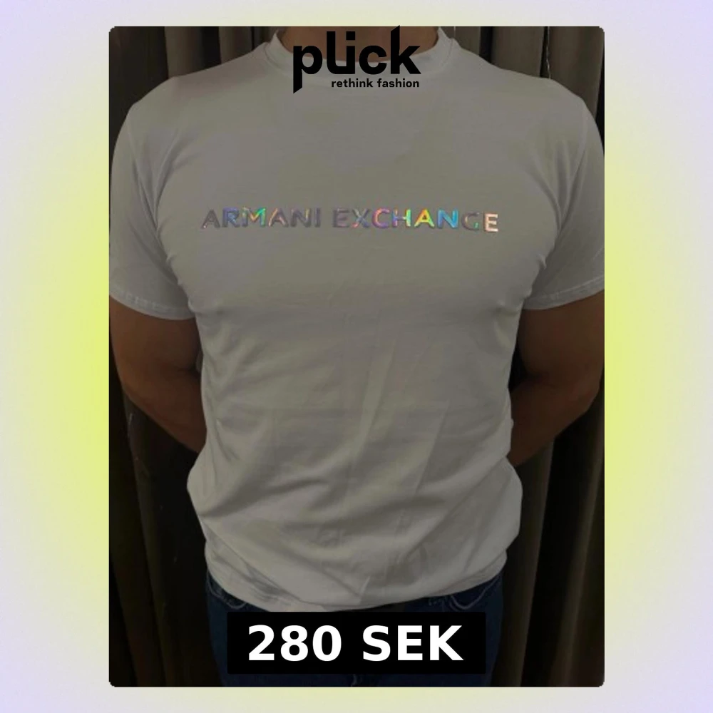 Säljer en clean vit t-shirt från Armani Exchange med holografiskt tryck på bröstet. Modellen är klassisk med rund hals och korta ärmar. Materialet känns mjukt och skönt, perfekt till jeans eller shorts. Loggan ger en snygg och modern vibe.