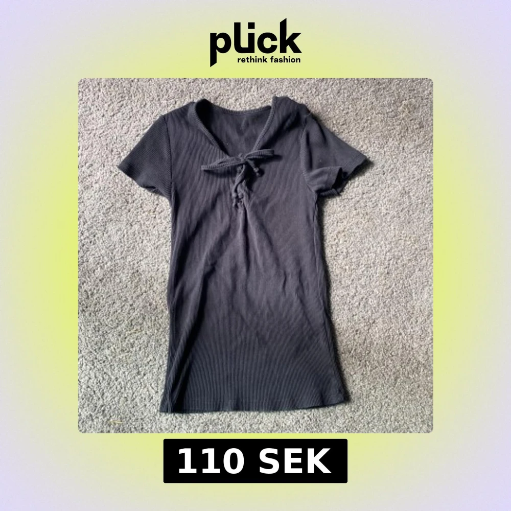 Svart ribbad tröja i 100% bomull från The Black Label Collection (lager 157) Kortärmad modell med v-ringning och dekorativ knytning framtill. Enkel och stilren design som passar perfekt till sommaren. På en utav bilderna såg tröjan grå ut men tröjan är svart. Materialet är stretchig.