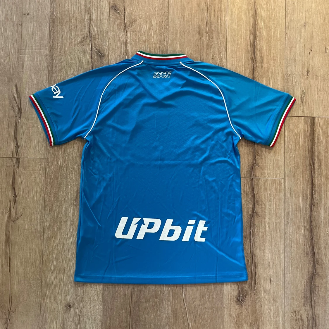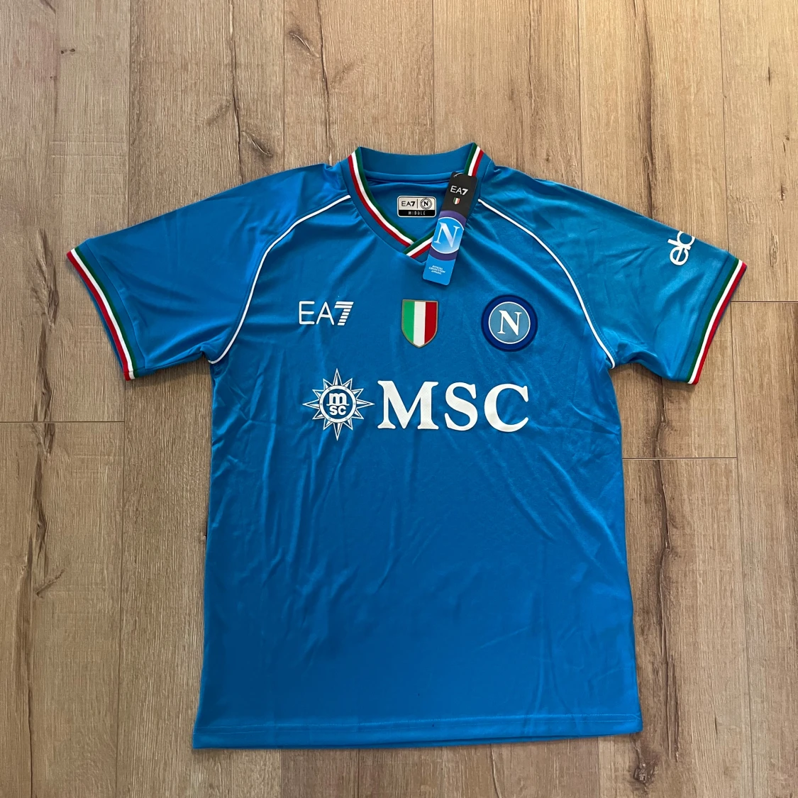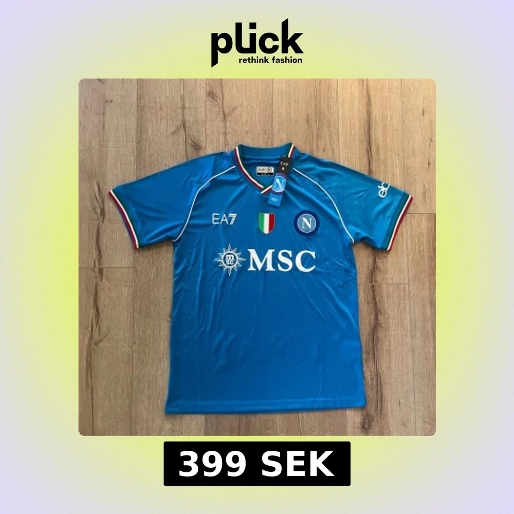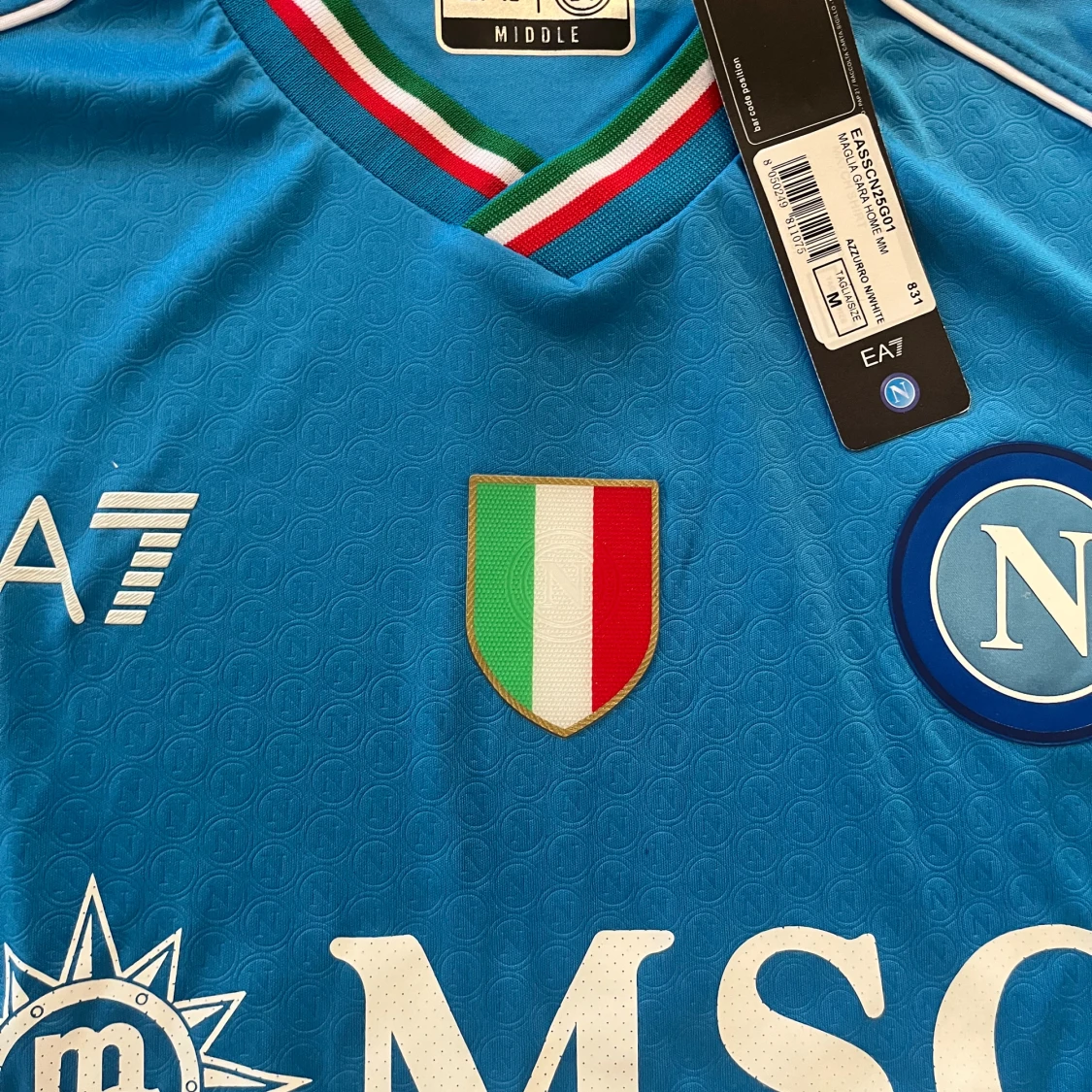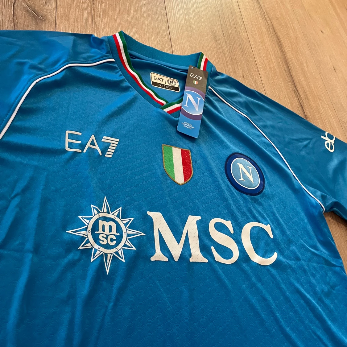 Napoli fotbollströja från EA7 i blått med vita detaljer och klubbmärke på bröstet. V-ringad krage med italienska flaggans färger, korta ärmar och tryckta sponsorer. Tillverkad i lätt polyester som andas, perfekt för match eller träning.