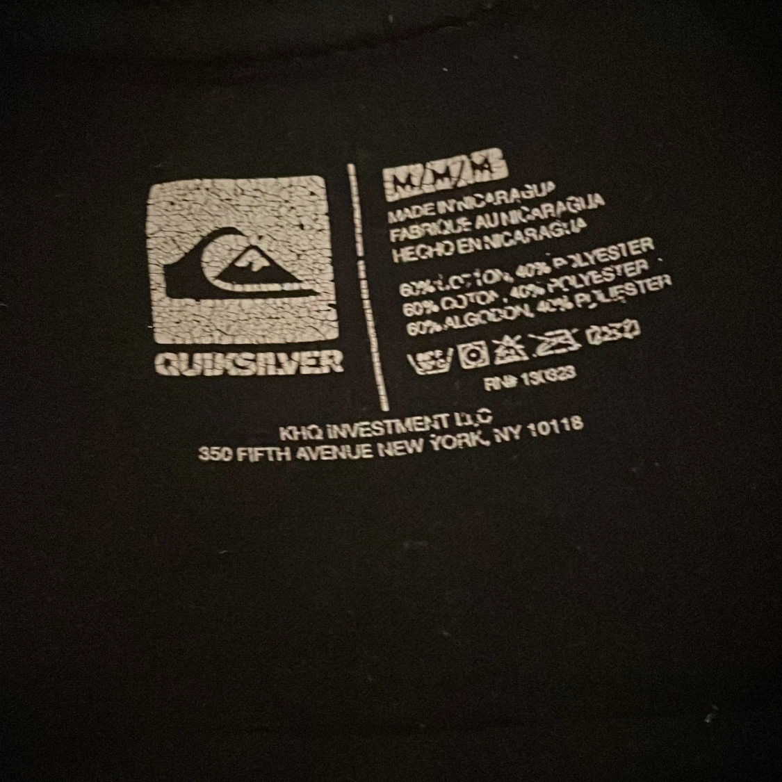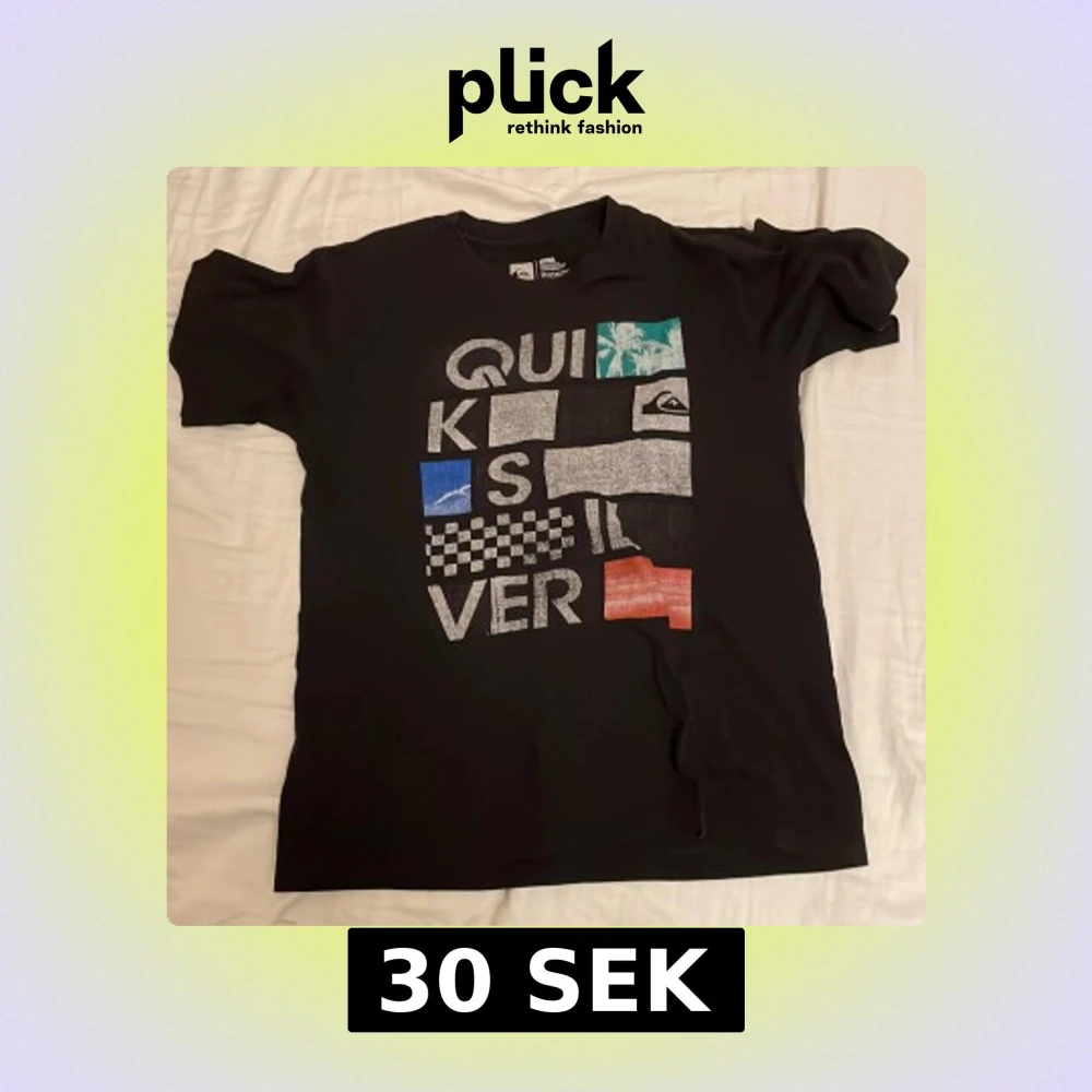 Svart t-shirt från Quiksilver med stort grafiskt tryck framtill i flera färger och mönster, bland annat rutor och palmer. Klassisk passform med rund hals och korta ärmar. Materialet är en mjuk blandning av bomull och polyester.
